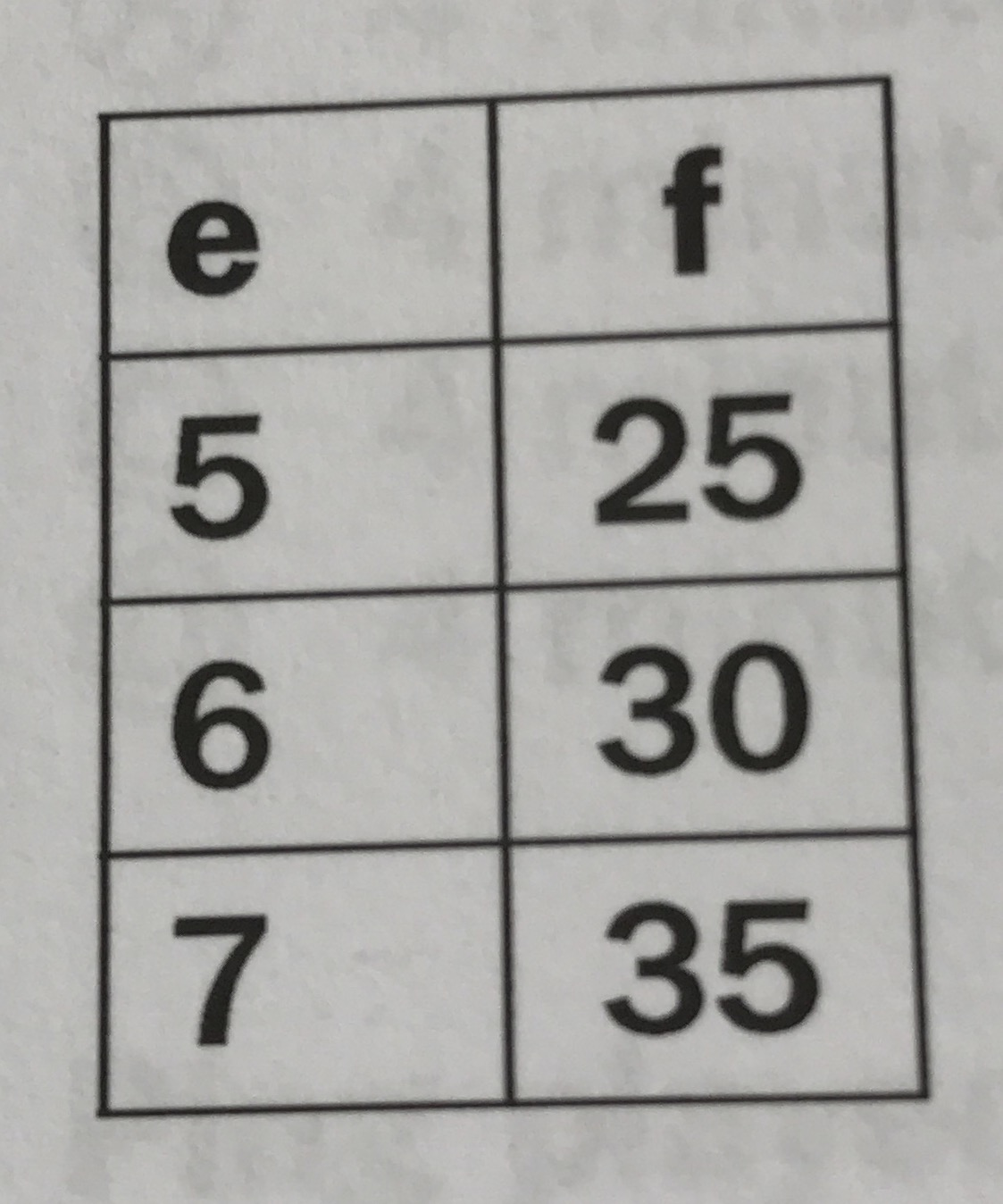 Use the table to determine the value of f when e is 11?