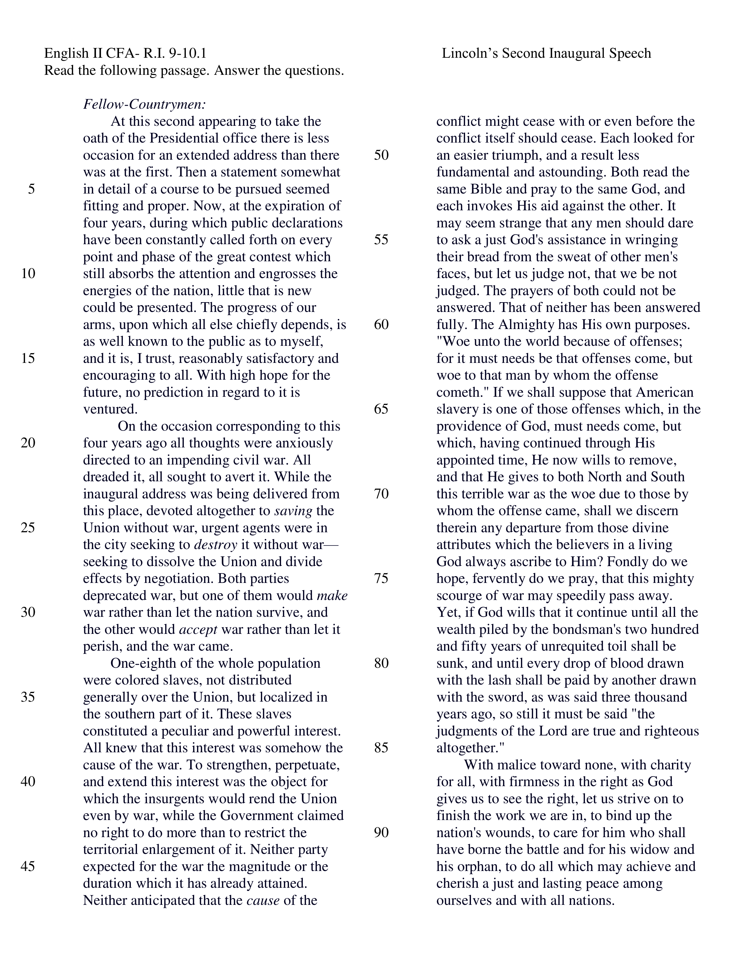 CFA-ELA- R.I. 9-10.1- Lincoln's Second Inaugural Address