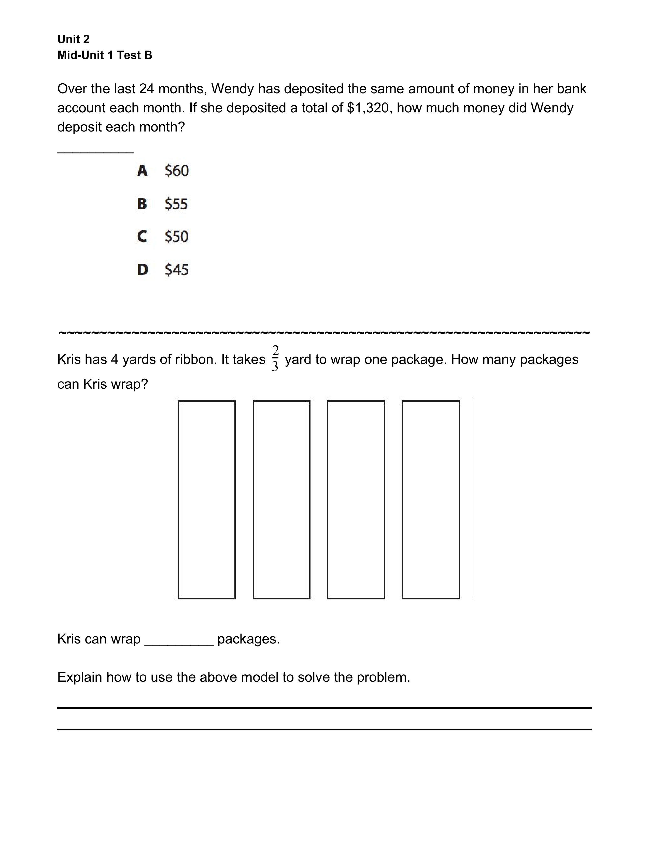 Kris has 4 yards of ribbon. It takes 2/3 yard to wrap one package. Use the model to show how many packages Kris can wrap.