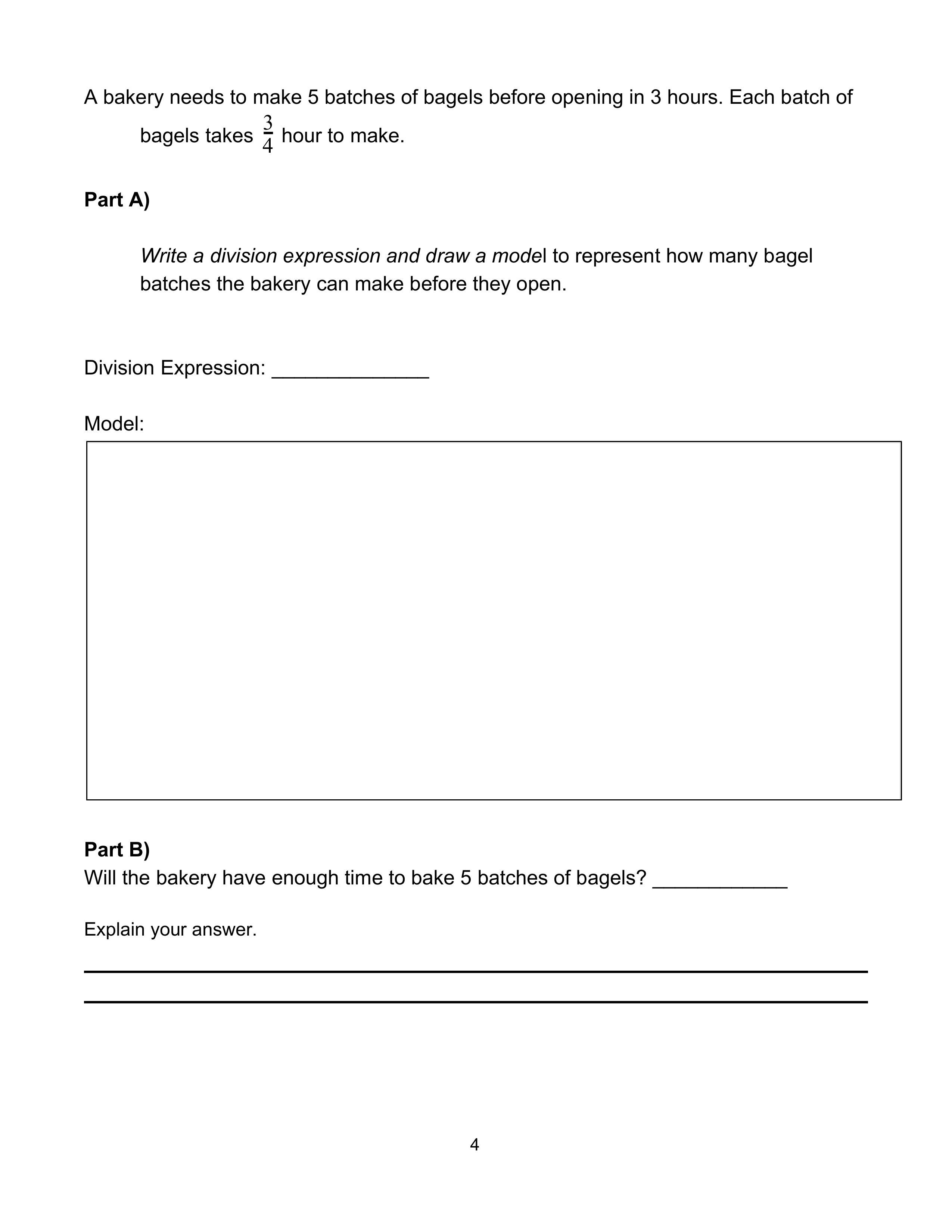 Write a division expression to represent how many bagel batches the bakery can make before they open given they have 3 hours and each batch takes 3/4 hour to make. (You an use the answer form "_____ divided by _____")