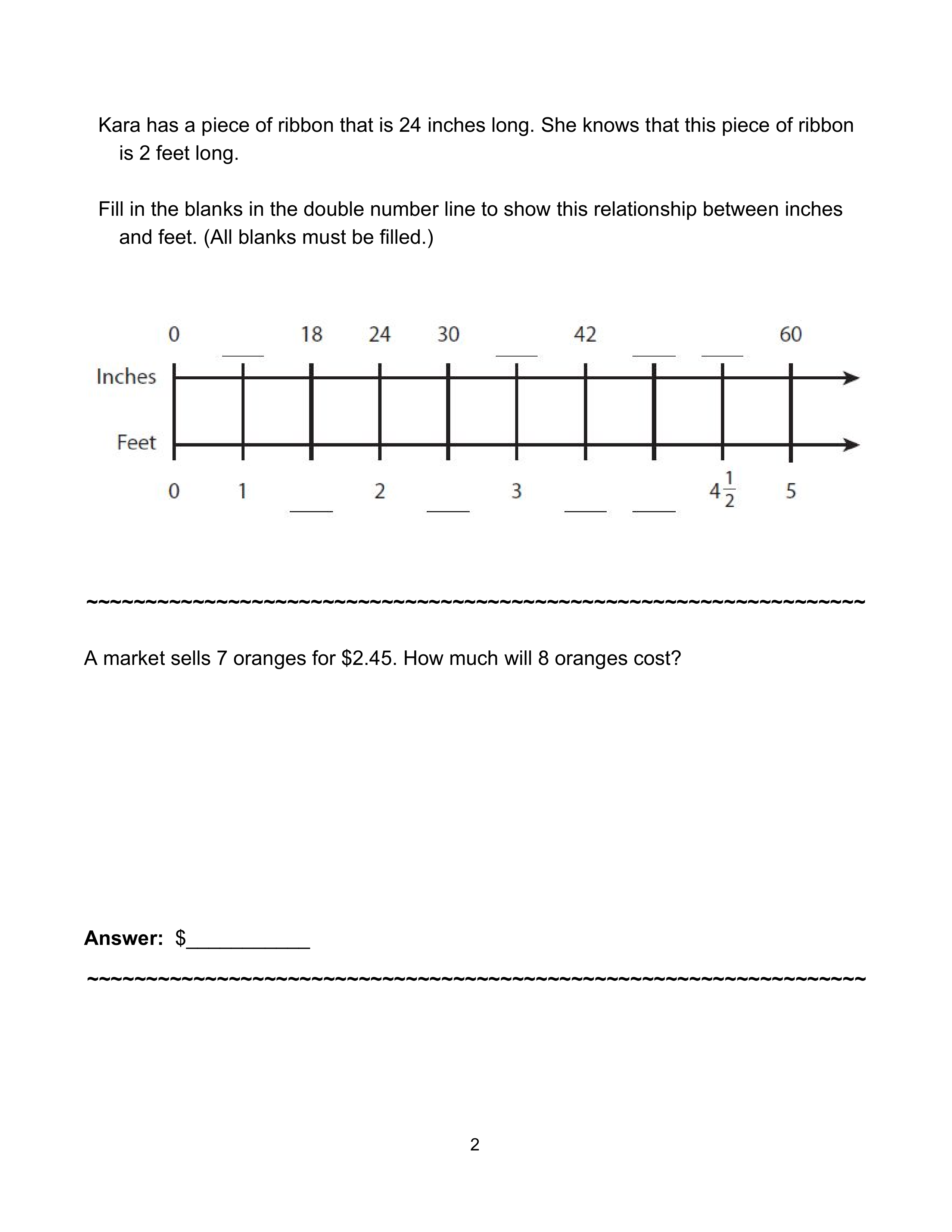 Kara has a piece of ribbon that is 24 inches long. She knows that this piece of ribbon is 2 feet long. Fill in the blanks in the double number line to show this relationship between inches and feet. (All blanks must be filled.)