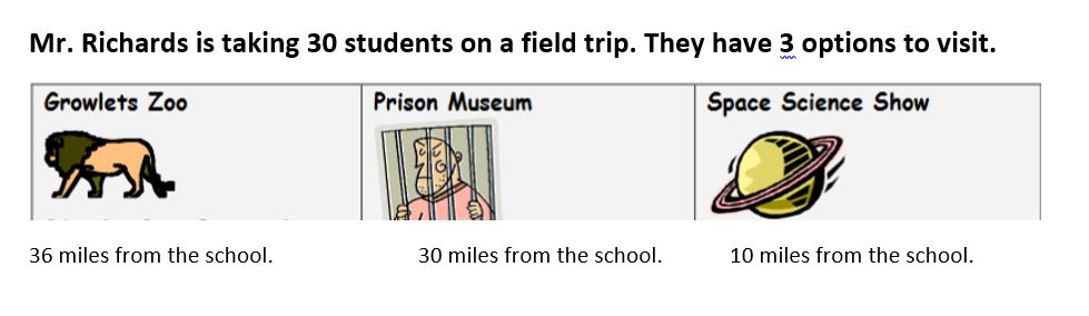 ***BONUS***The Principal informs Mr. Richards that if all students demonstrate good behavior for the next 2 weeks, the school will contribute $100 towards the field trip. Does this information change where the class can go on their field trip? Explain your reasoning.