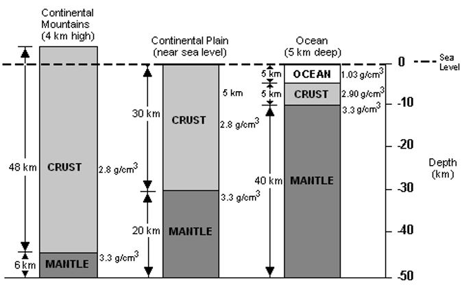Base your answer to the questions below on the Earth Science Reference Tables, the diagram below, and your knowledge of earth science. The diagram represents three cross sections of the Earth at different locations to a depth of 50 kilometers below sea level. The measurements given with each cross section indicate the thickness and density of the layers.