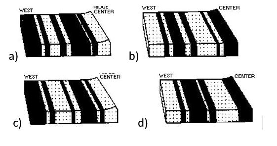 Which diagram below best represents the pattern of magnetic orientation in the seafloor on the west side of the ocean ridge?