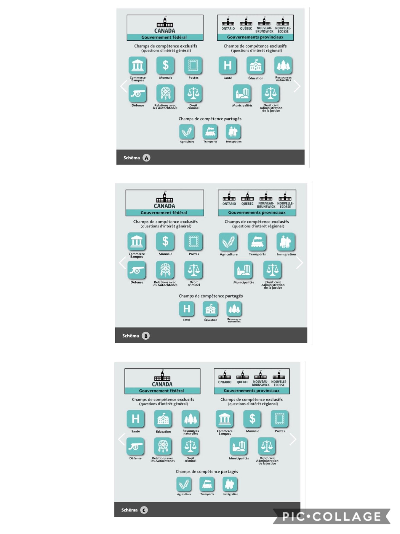 Lequel des schémas du carrousel illustre le mieux le partage des compétences entre le gouvernement fédéral et les gouvernements provinciaux?