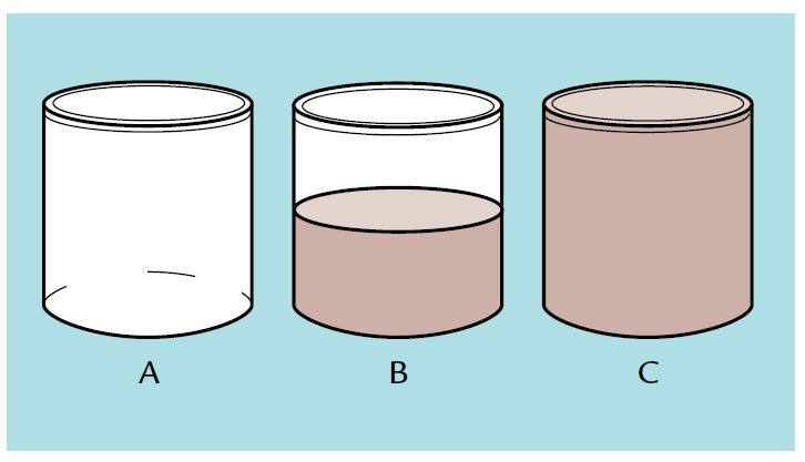 See the three identical barrels, one empty, one half-full of water, and one full of water.