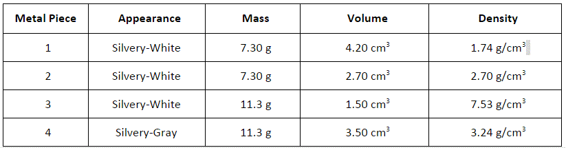 Write a scientific explaination about whether any of the pieces of metal are the same. Be sure to include: