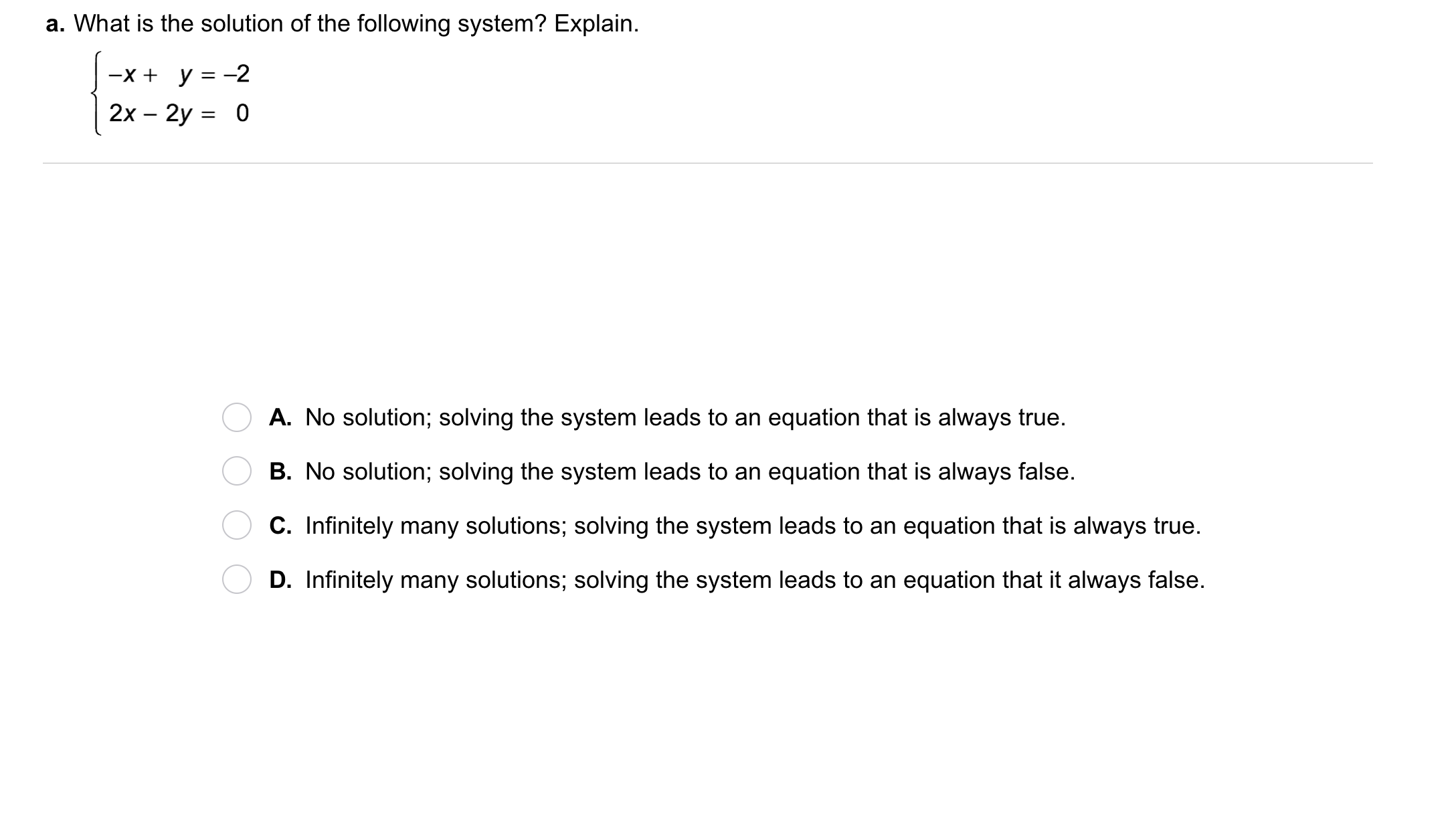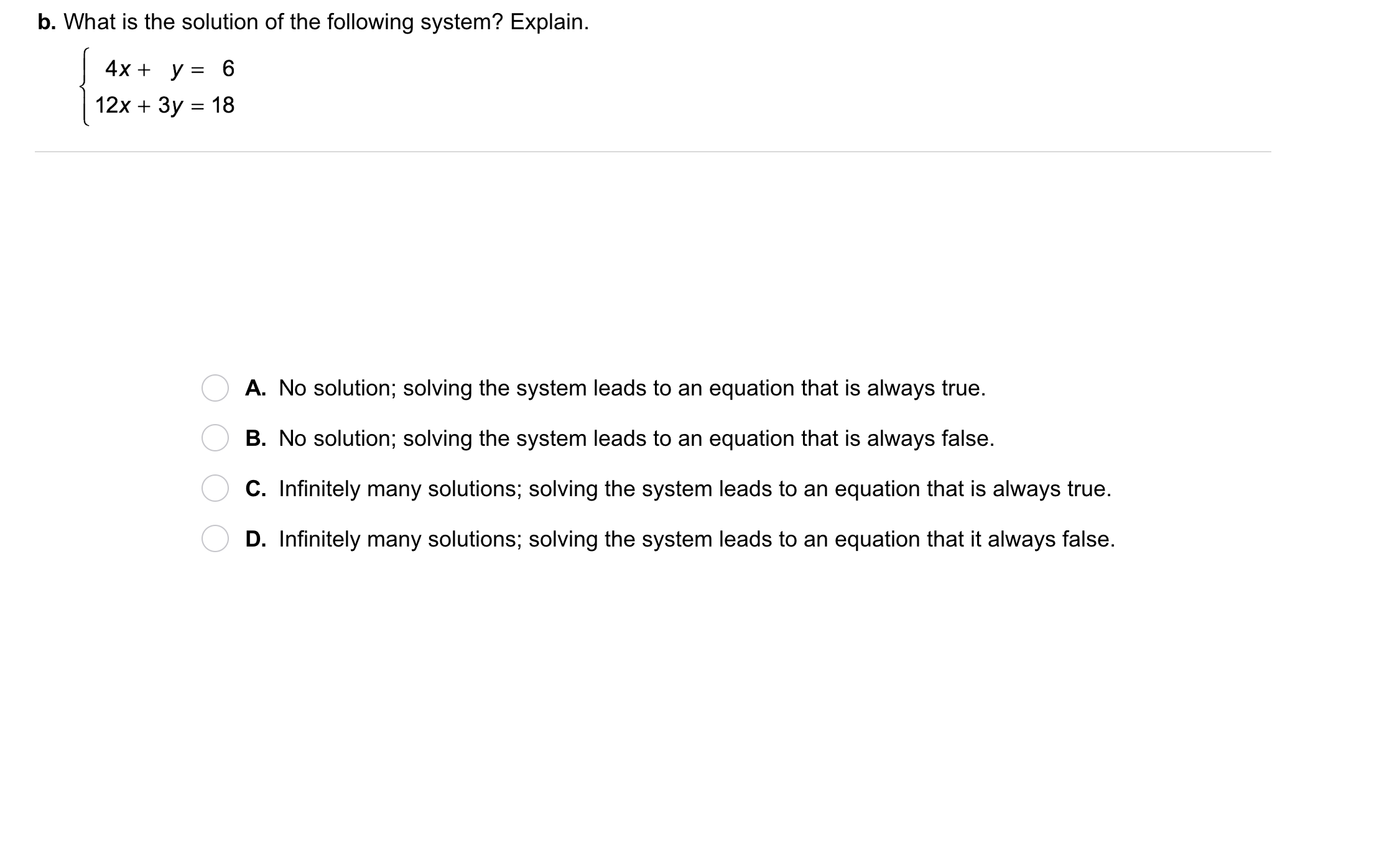 Take Note: Describe how, when solving a system, you can recognize that the system is always true and has infinitely many solutions.