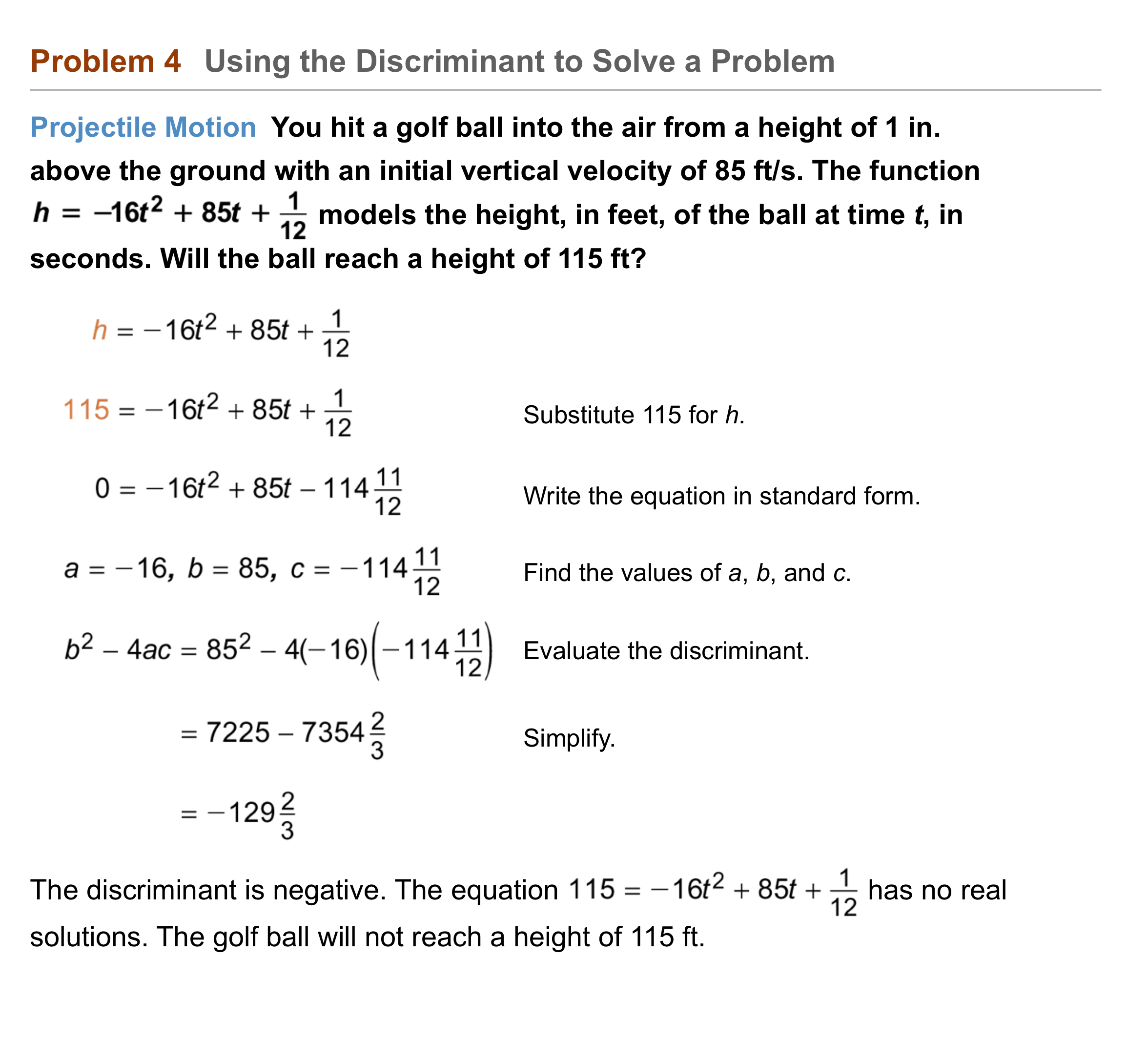 Problem 4 Got It? Reasoning: Will the golf ball in Problem 4 ever reach a height of 110 ft? Use the discriminant to explain your answer.