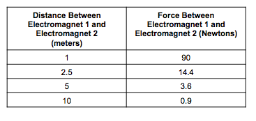 This table above shows the magnitude of electromagnetic force exerted by two electromagnets on each other as the distance between the two electromagnets is varied. The data on the table provide evidence for which of the following conclusions?