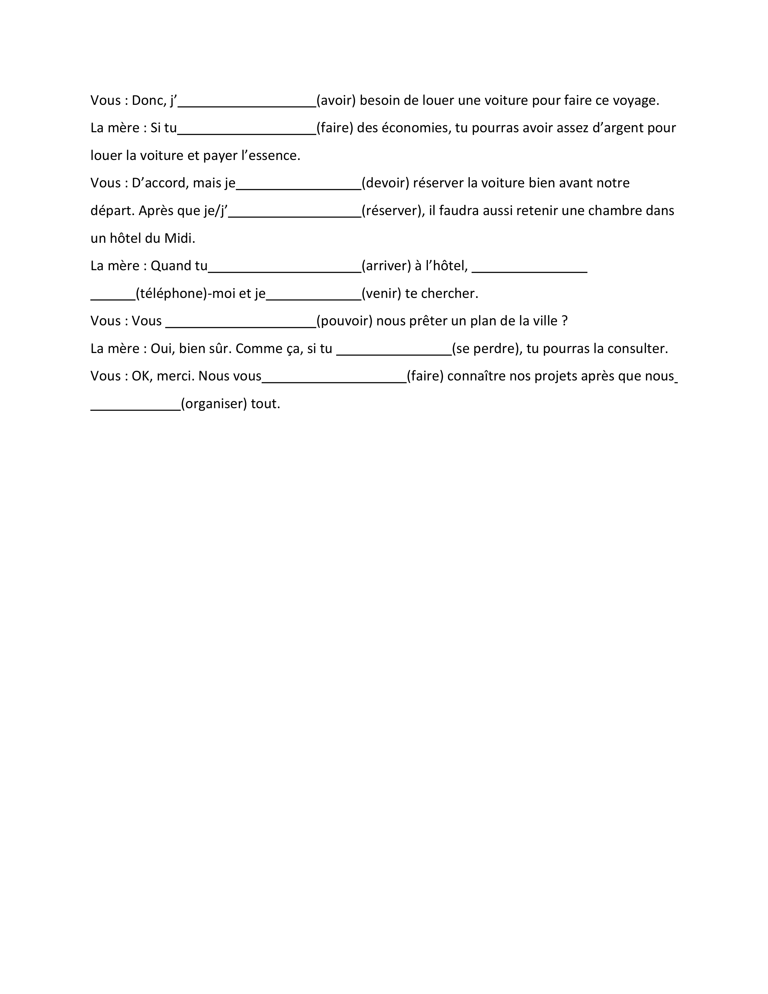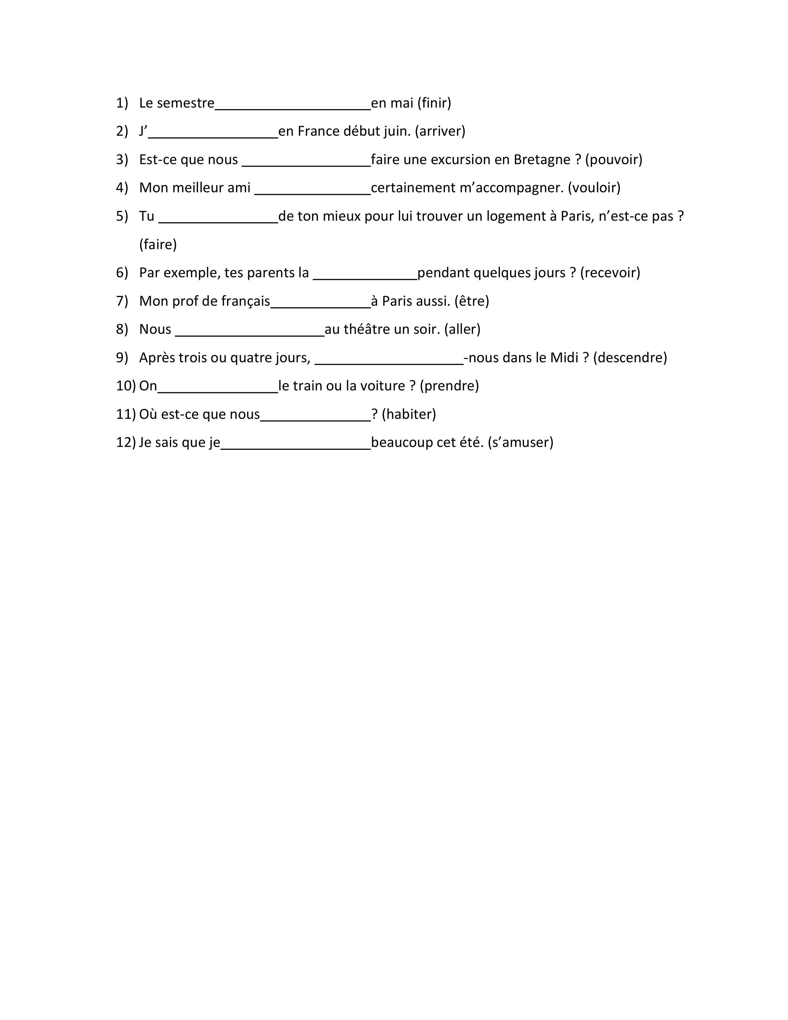 Pour pratiquer le futur, conjuguez les verbes en parenthèses au futur: