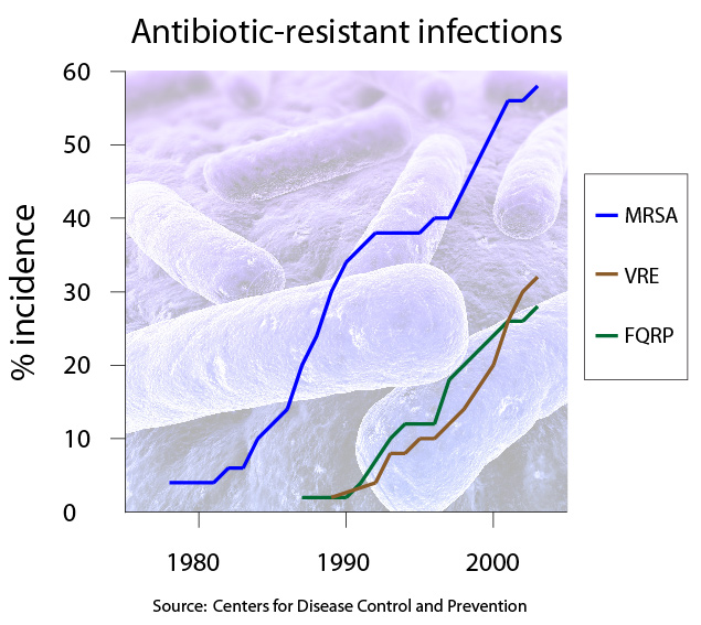 Observe the graph below. Explain what is occurring over time to the population of MRSA.