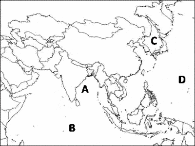 Which letter identifies the Indian Ocean?