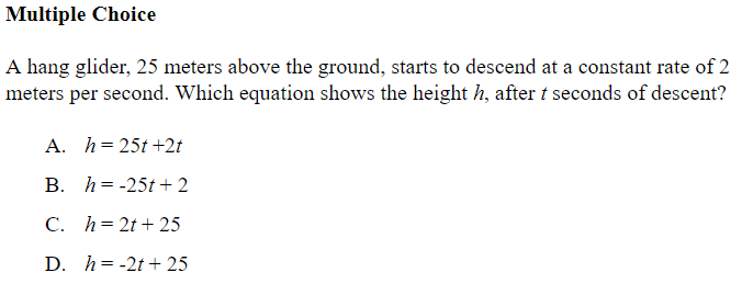 A1.ACE.1* Create and solve equations and inequalities in one variable that model real-world problems involving linear, quadratic, simple rational, and exponential relationships. Interpret the solutions and determine whether they are reasonable. (Limit to linear; quadratic; exponential with integer exponents.