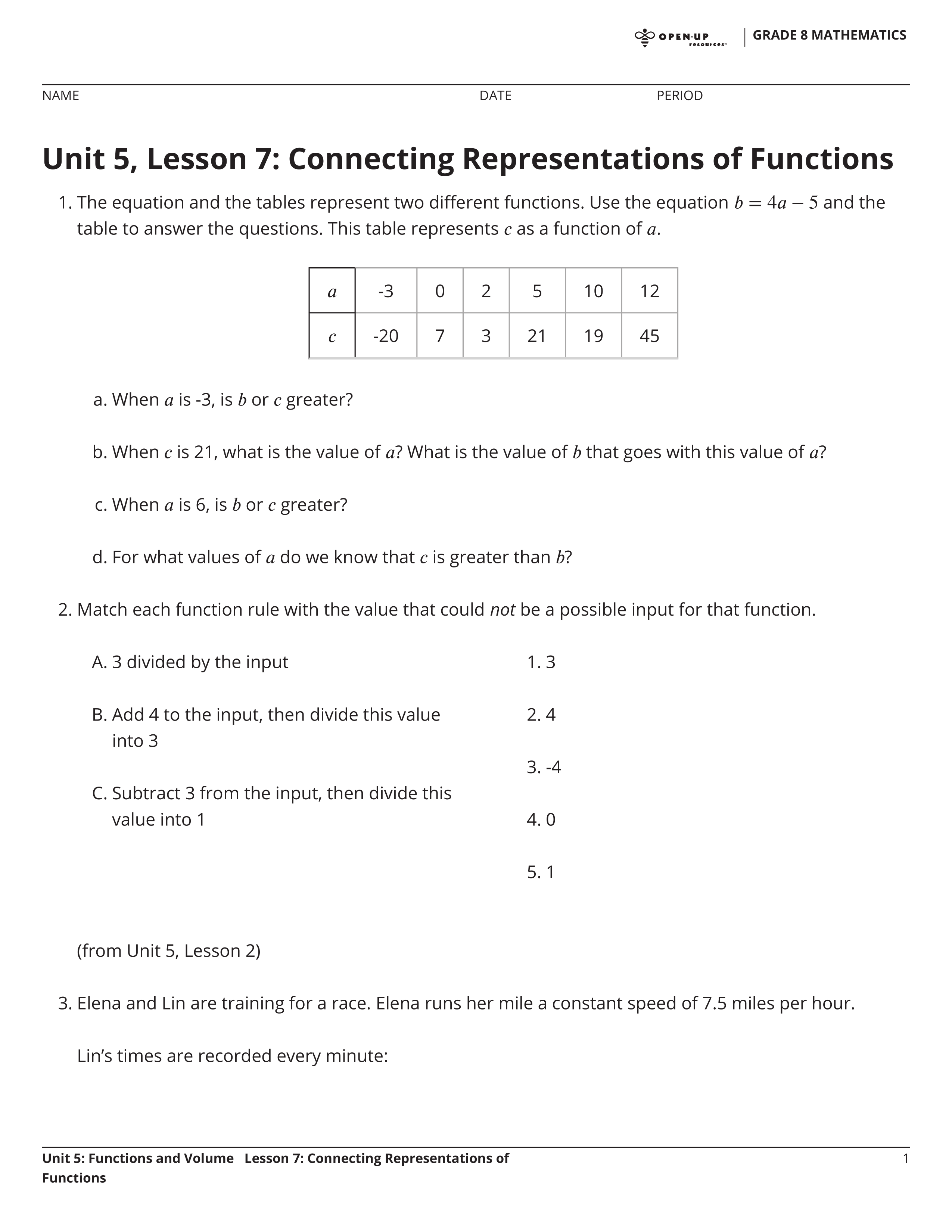 What is the value of c when a is -3?