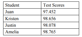 The table shows the science test scores of four students. Which student’s score is 98.8 when rounded to the nearest tenth?