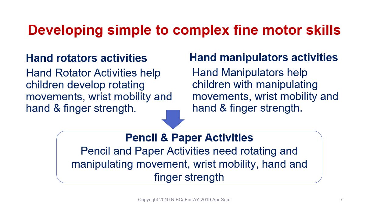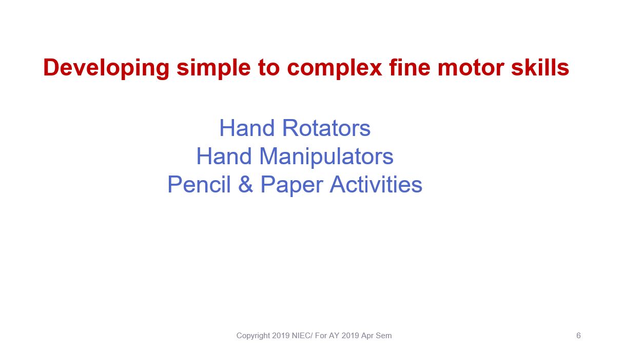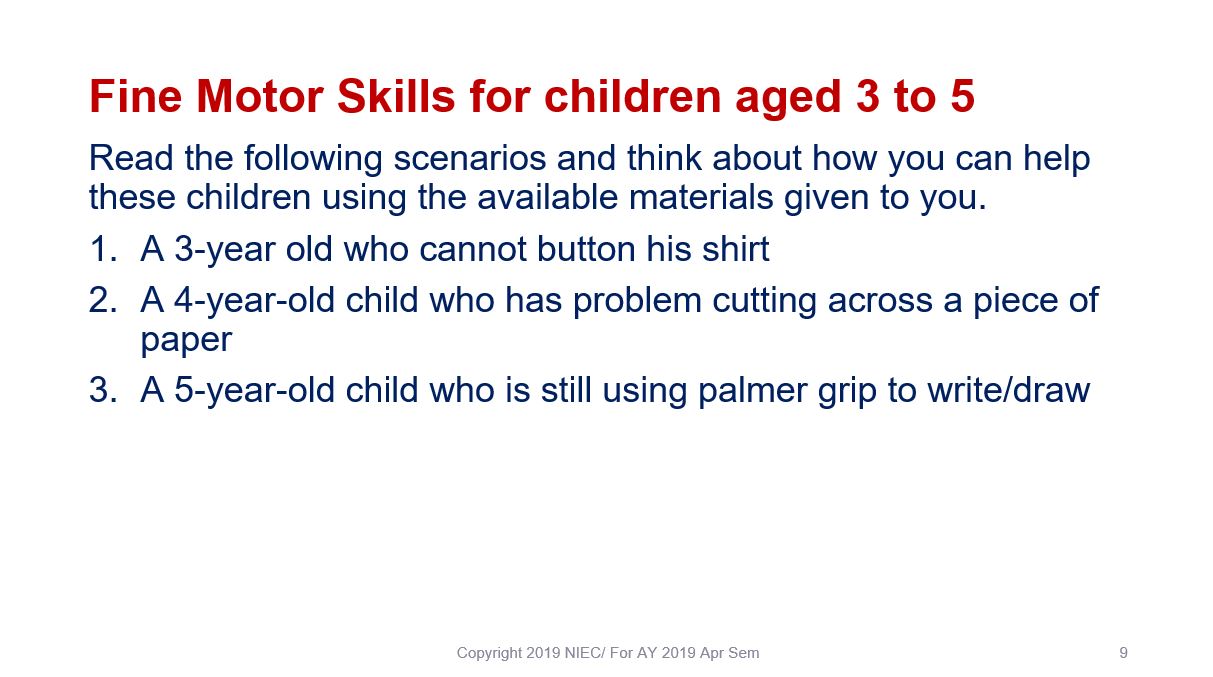 Dear ECDE and TSE Students, complete the online activities here and download the Powerpoint slides to help review your understanding on Fine Motor Activities and learn about selecting teaching resources/aids.