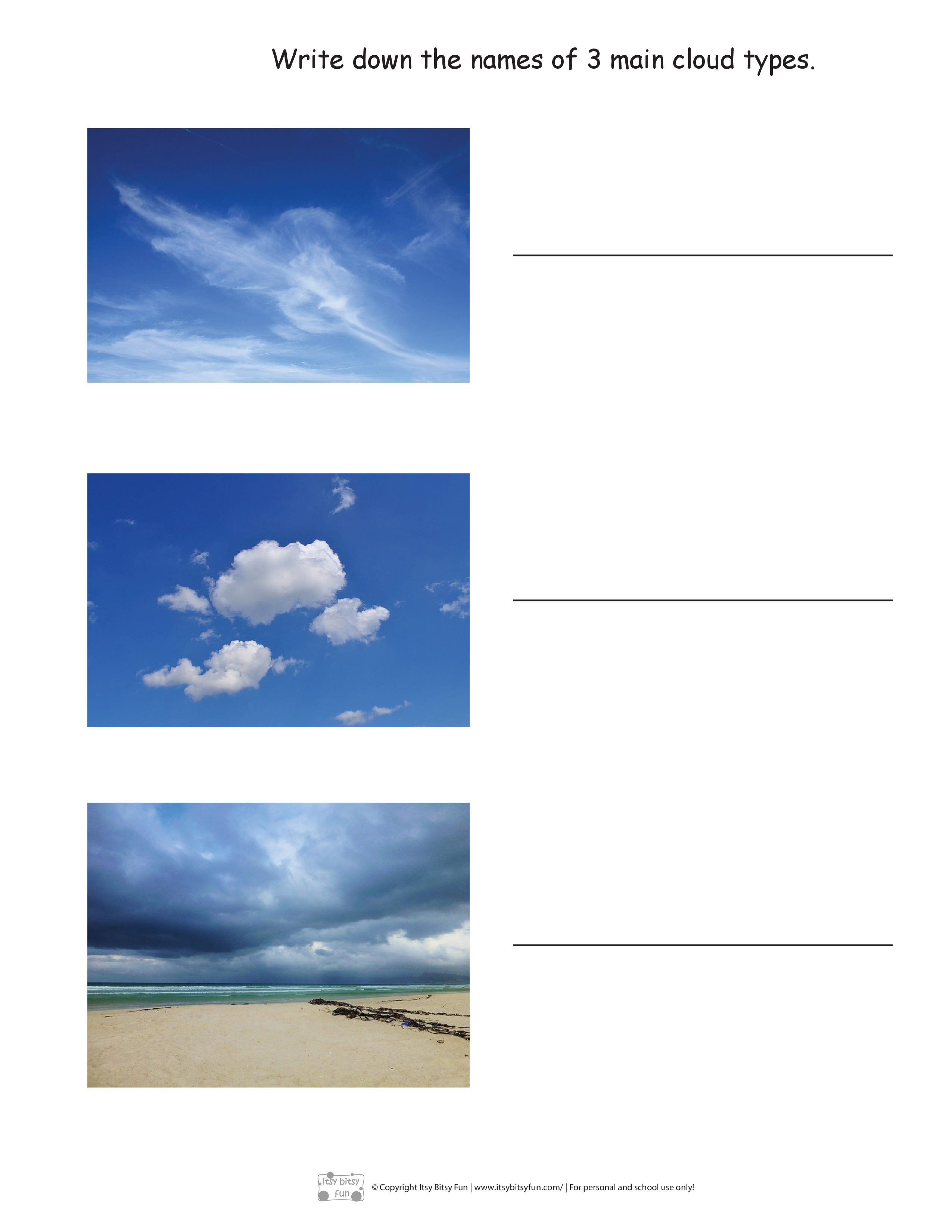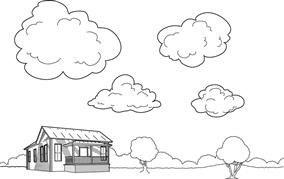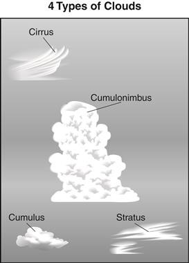 The drawing shows puffy, white clouds. When this type of cloud appears, what kind of weather usually occurs?
