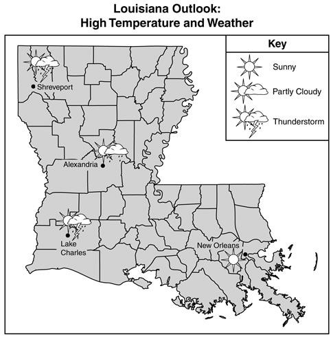 The map above is used to predict the weather for Tuesday. Which city most likely will be clear and dry?