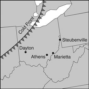 The diagram above shows a weather map. Which city is most likey to expereince the cold front first?