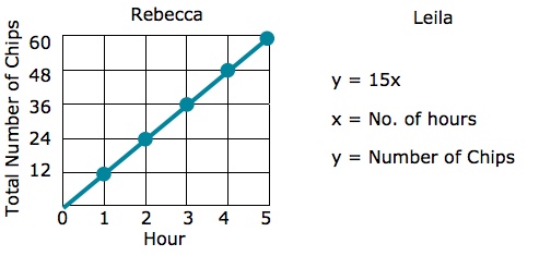 The graph below represents how many chips Rebecca eats in an hour. The equation represents the rate that Leila eats chips at. Find out who eats more chips in 3 hours.