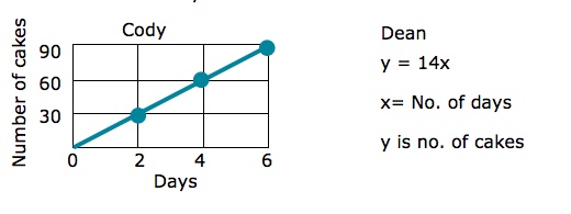 The graph below represents how many cakes Cody made. The equation represents the rate at which Dean makes cakes. Who makes the least number of cakes in five days?