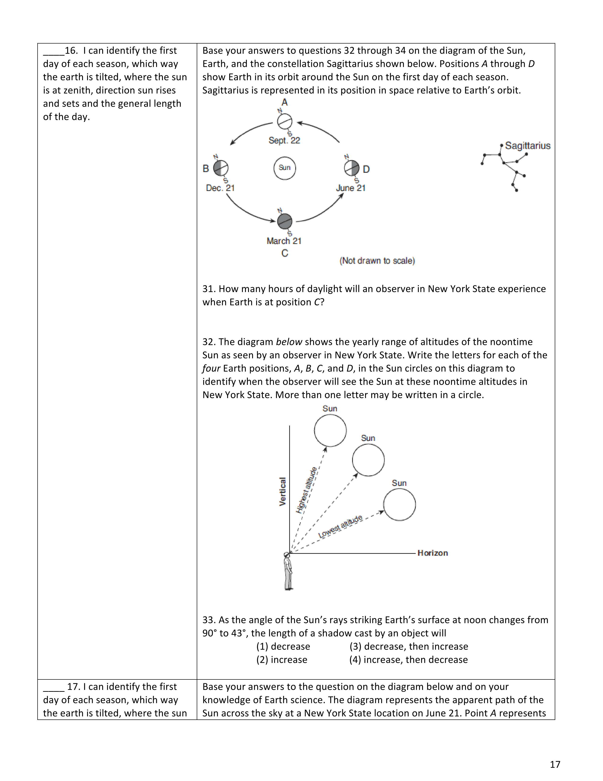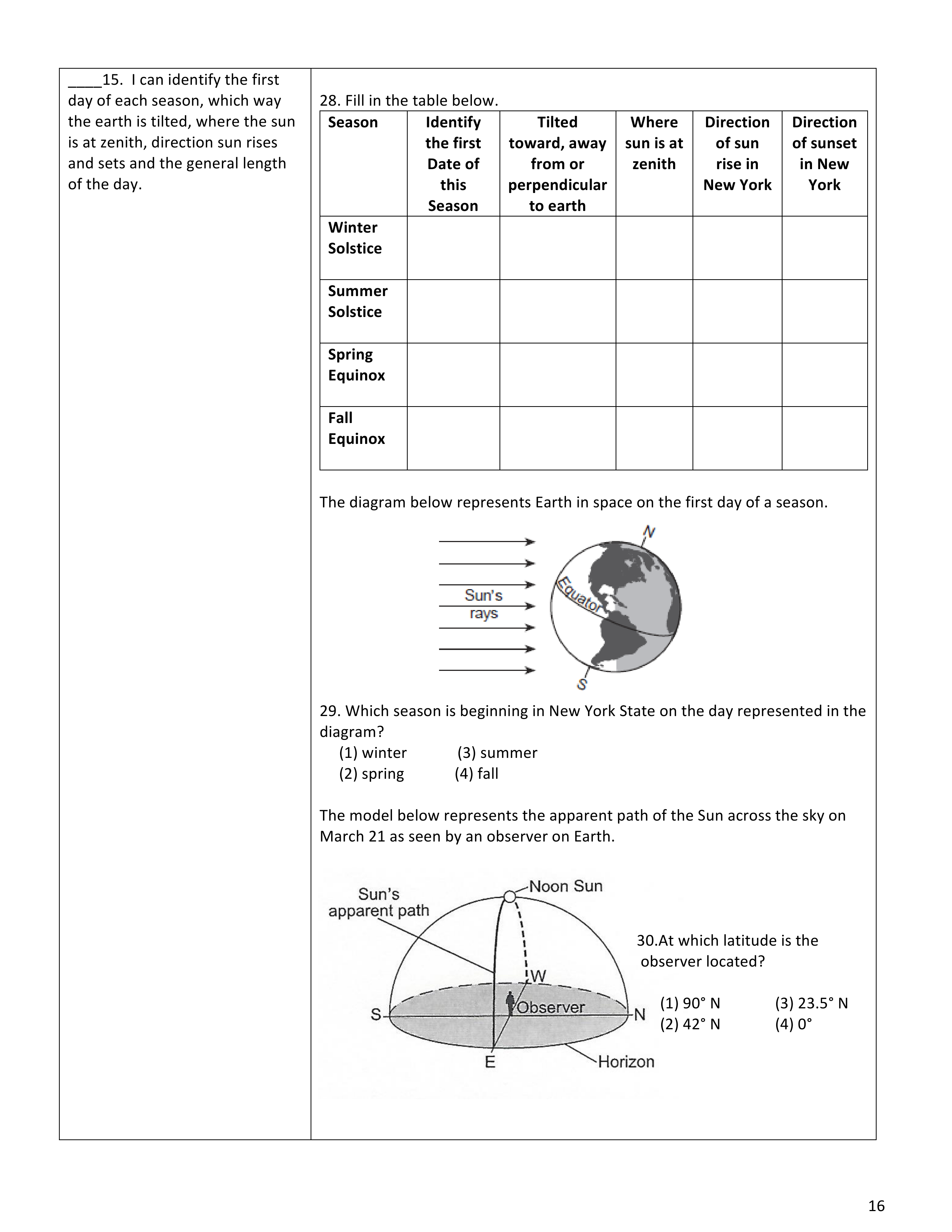 In the summer, which is on the date of ____________ st, the Sun is the ____________ altitude in the sky. This makes the length of day the ____________ duration. For the winter in the Northern Hemisphere, which is on ________________ st, everything is the _____________ .