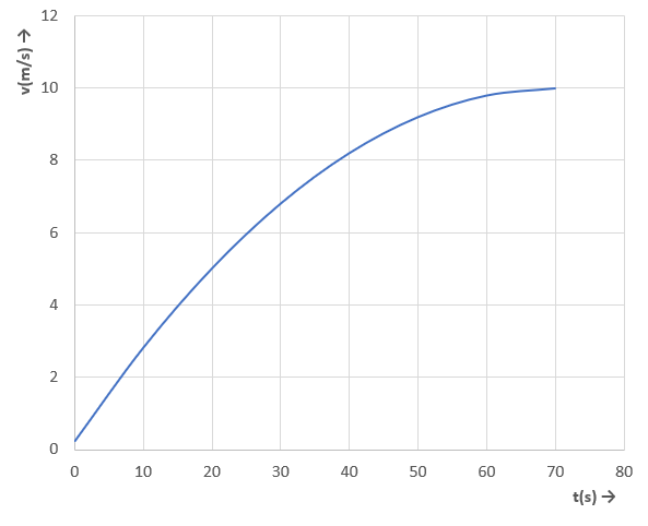 In de figuur zie je een (v,t)-grafiek.Bereken de verplaatsing (in m) tussen t = 0 en t = 10 s; antwoord bestaat uit een getal + eenheid