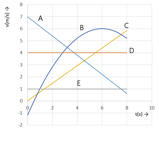 In het (v,t)-diagram zie je een aantal lijnen (A t/m E).Welke lijnen horen bij een eenparige beweging?