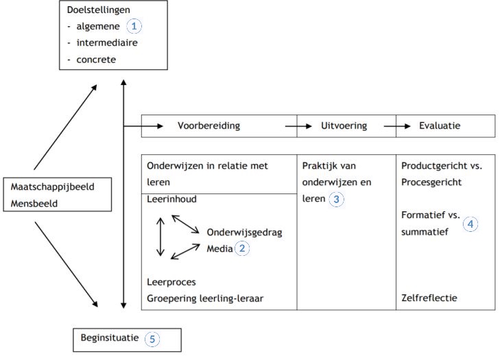 De vakdidactiek wordt opgebouwd rond het vakdidactisch model (Van Gelder, 1971) waarin de verschillende componenten van het lesgeven, alsook hun onderlinge samenhang, worden weergegeven: