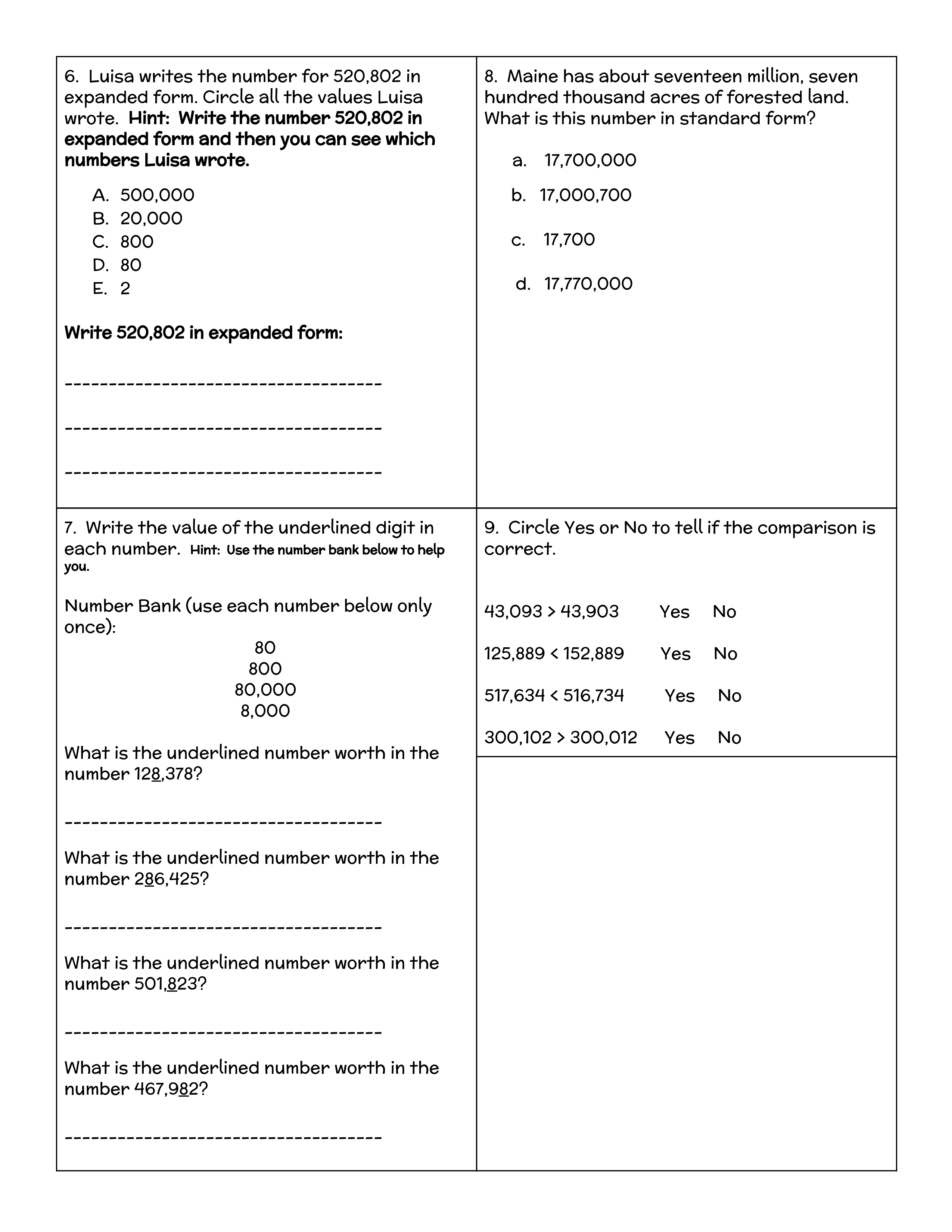 Luisa writes the number for 520,802 in expanded form. Circle all the values Luisa wrote. Hint: Write the number 520,802 in expanded form and then you can see which numbers Luisa wrote.