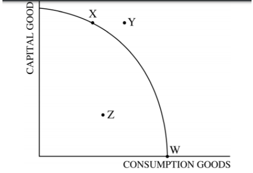 Assume that this society is currently producing at combination X, where they are allocating more resources toward the production of capital goods (physical capital) than consumer goods (clothing, toys, etc.). Which of the following is the most likely result of the allocation choice?