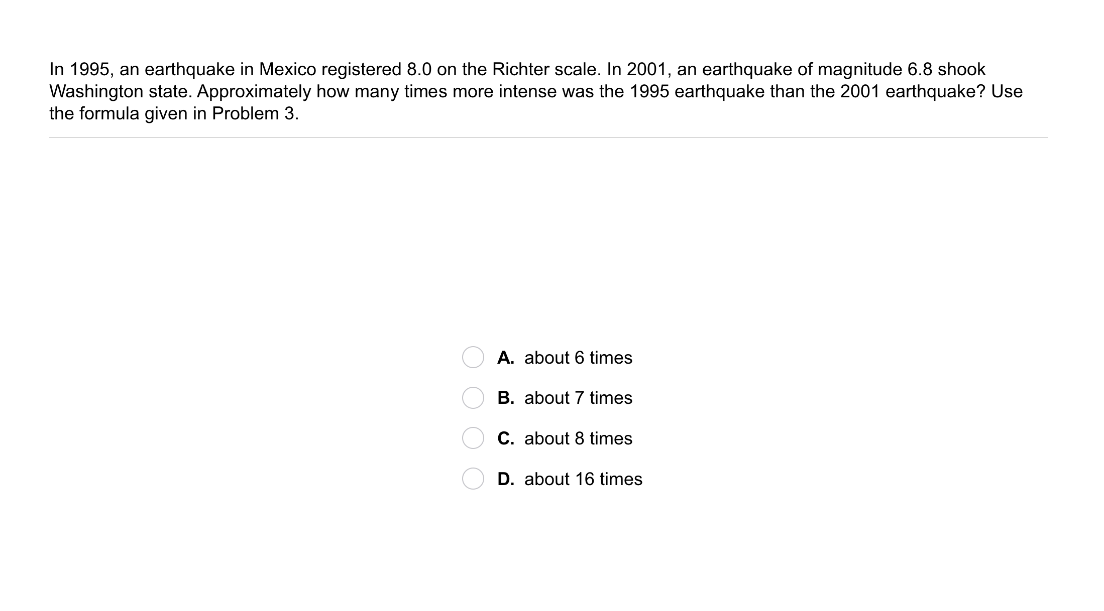 Problem 3 Got It? In 1995, an earthquake in Mexico registered 8.0 on the Richter scale. In 2001, an earthquake of magnitude 6.8 shook Washington state. Approximately how many times more intense was the 1995 earthquake than the 2001 earthquake? Use the Formula in Problem 3.