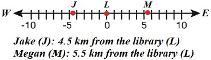 Megan and Jake both live on the same street that the library is on. How many kilometers (km) apart do Megan and Jake live? Use the image below to help you.