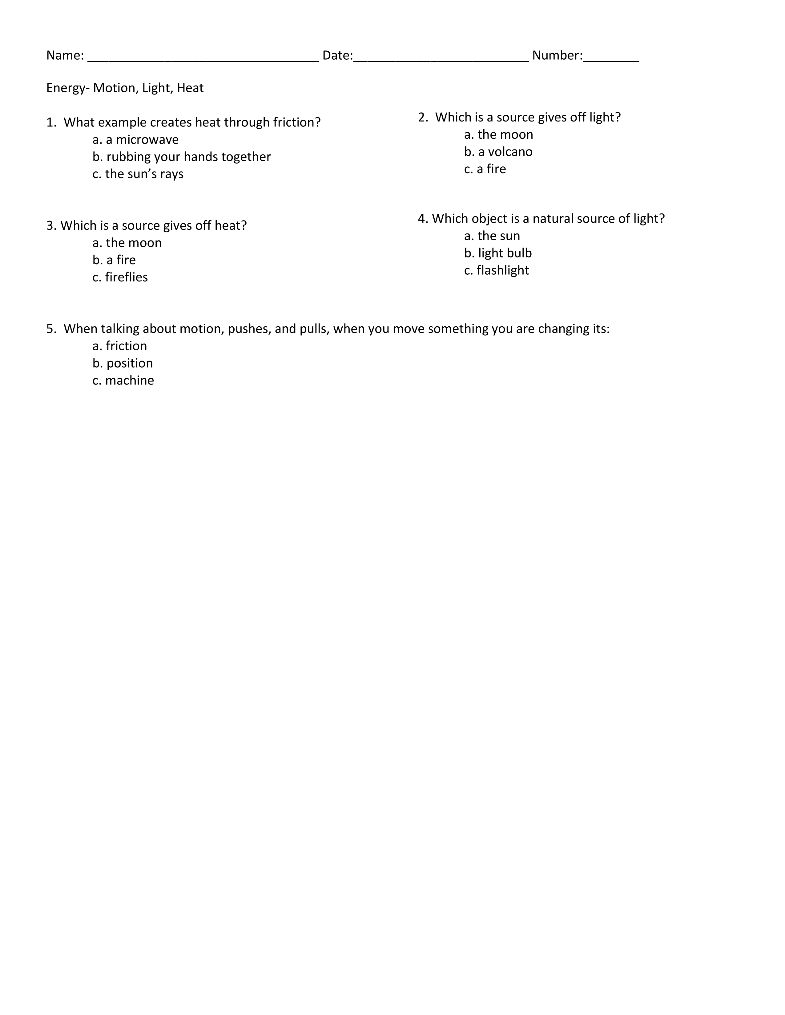 Energy-Motion, Light, Heat Quick Check