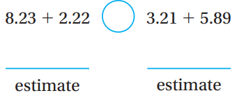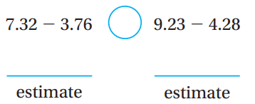 Estimate to the nearest whole number. Then compare using <, >, or =.