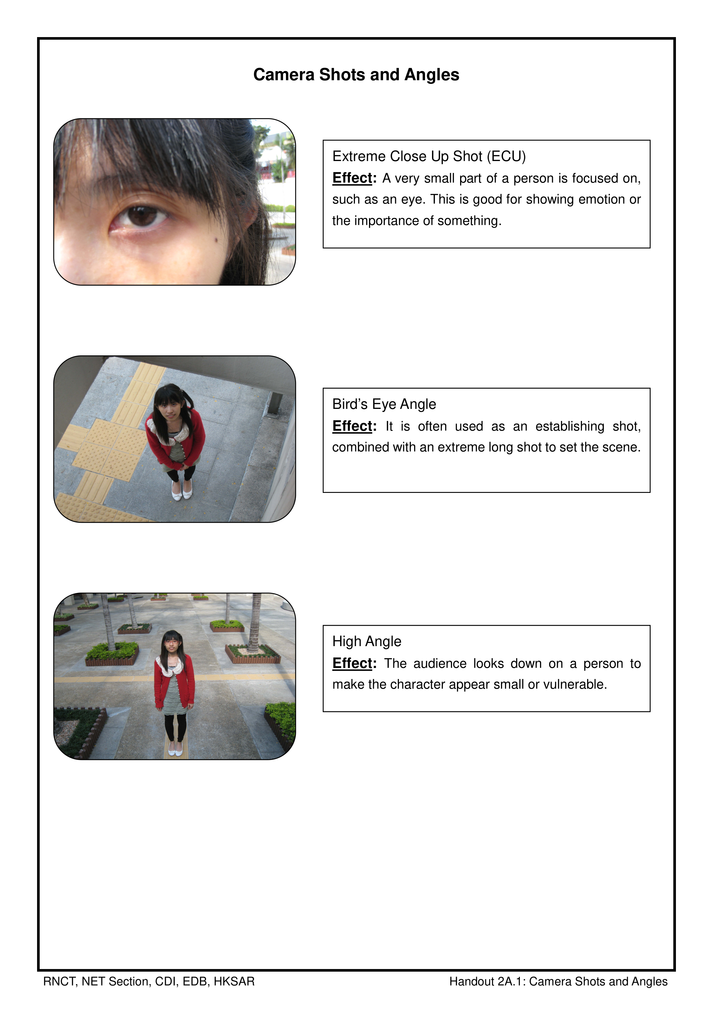 Look at the image above, identify the camera angle and the mood.Justify your choice