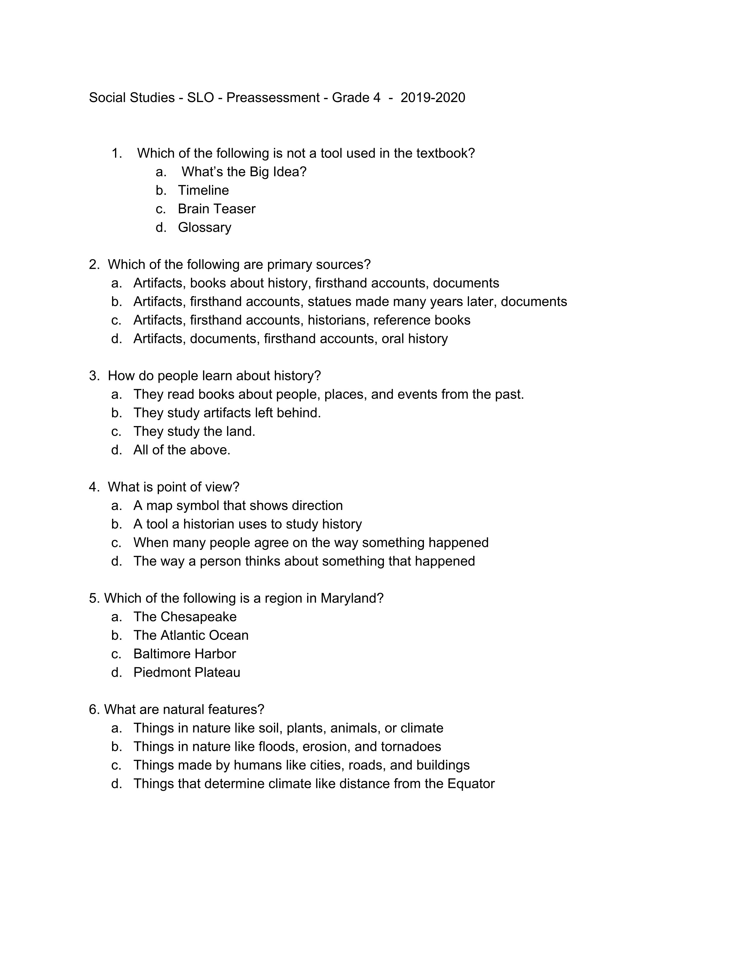 Gr. 4 Social Studies SLO Preassessment 2019-20