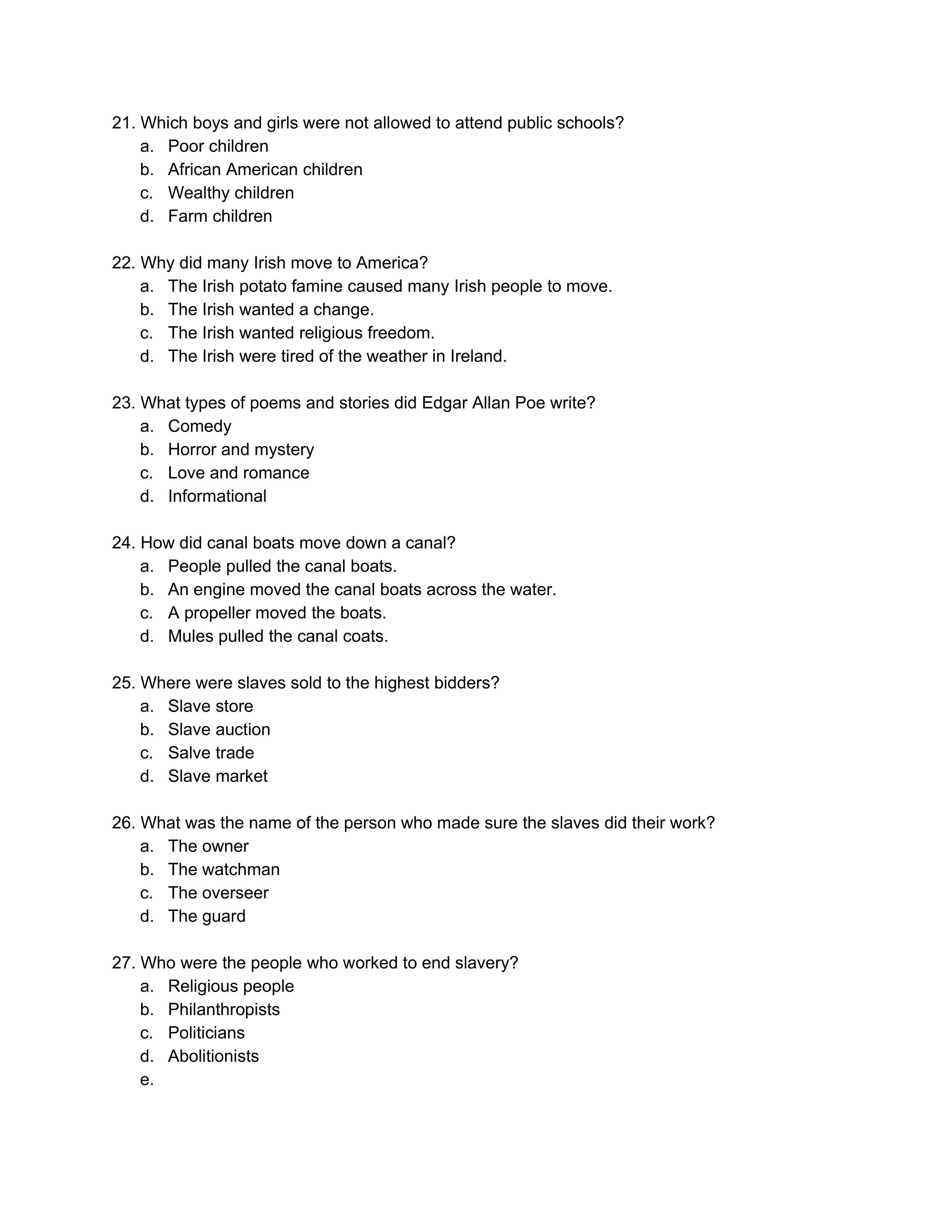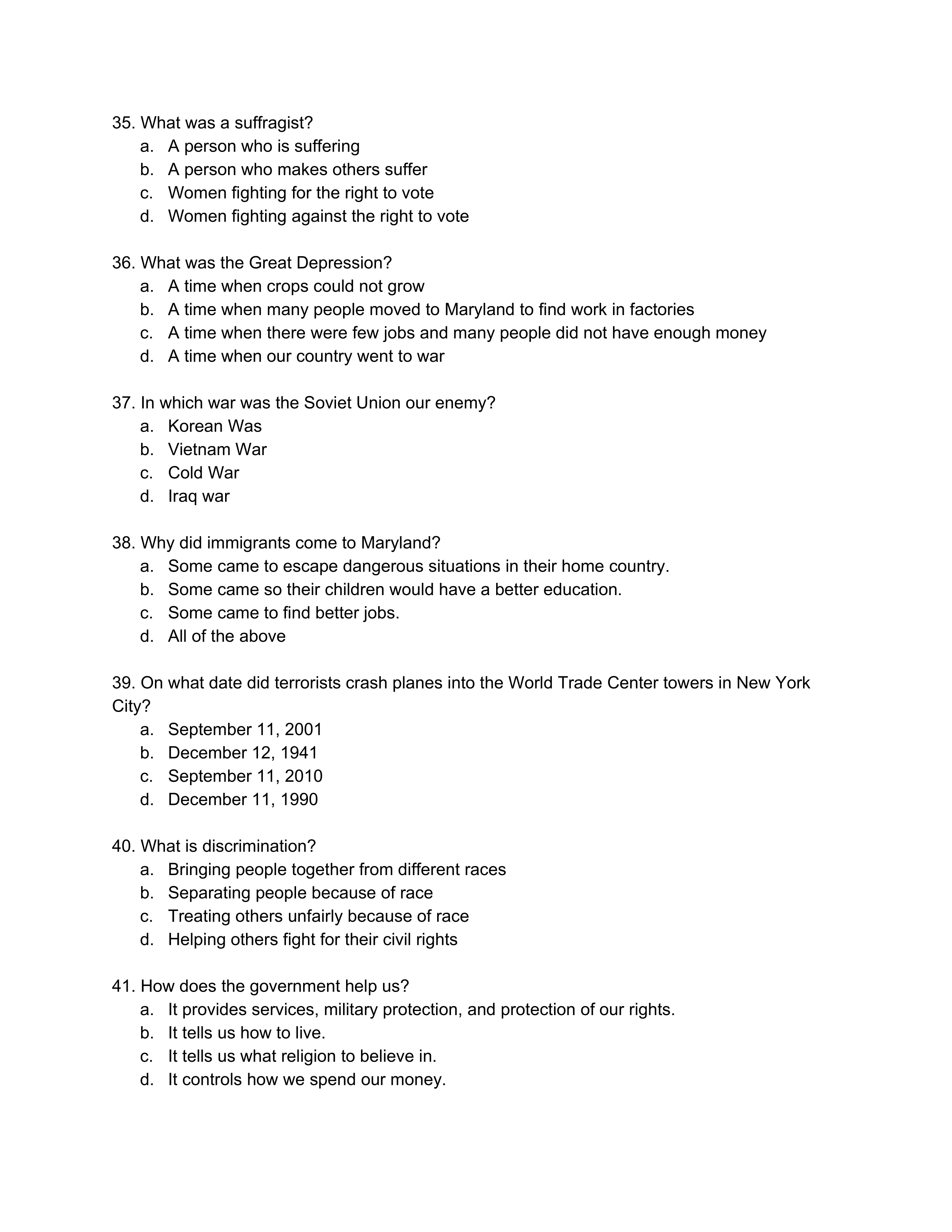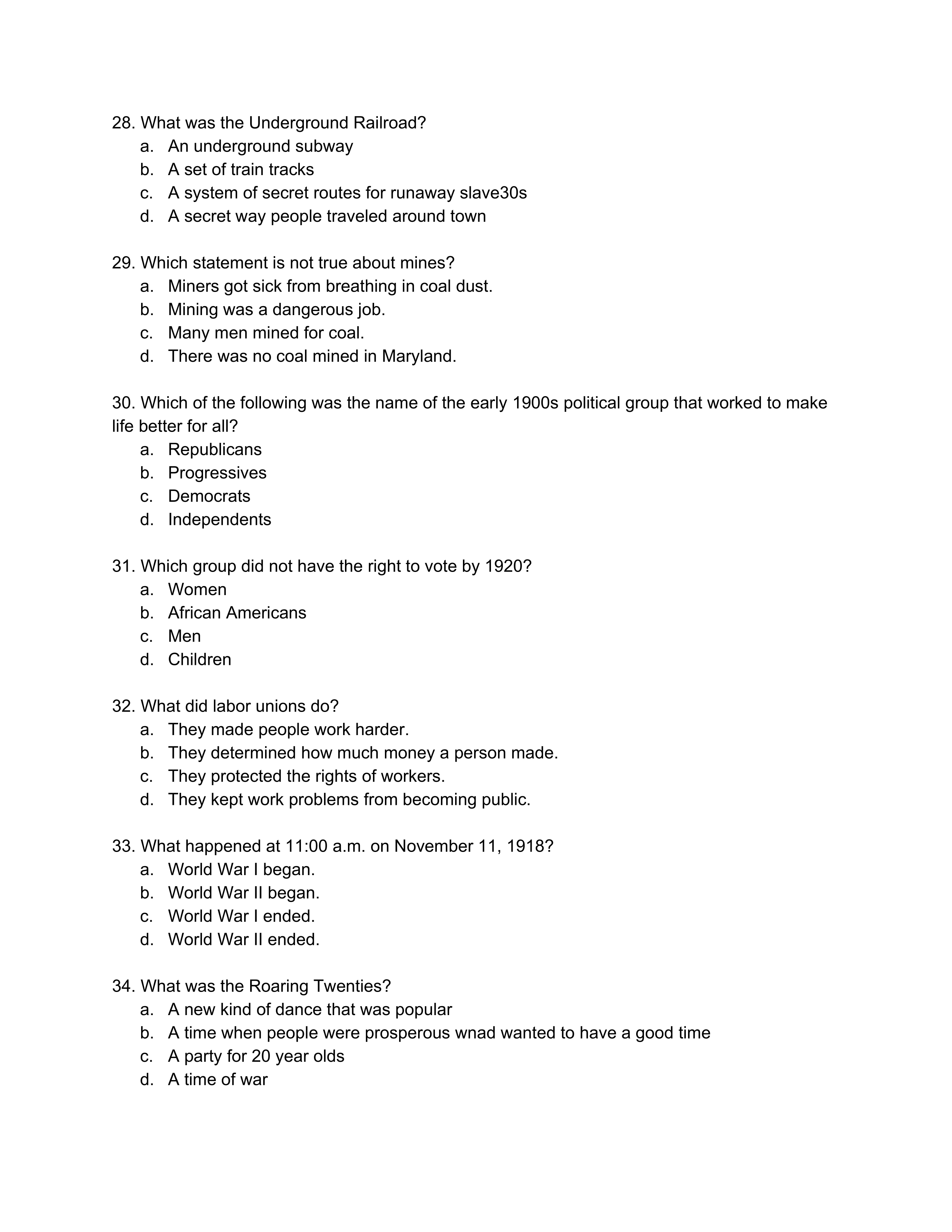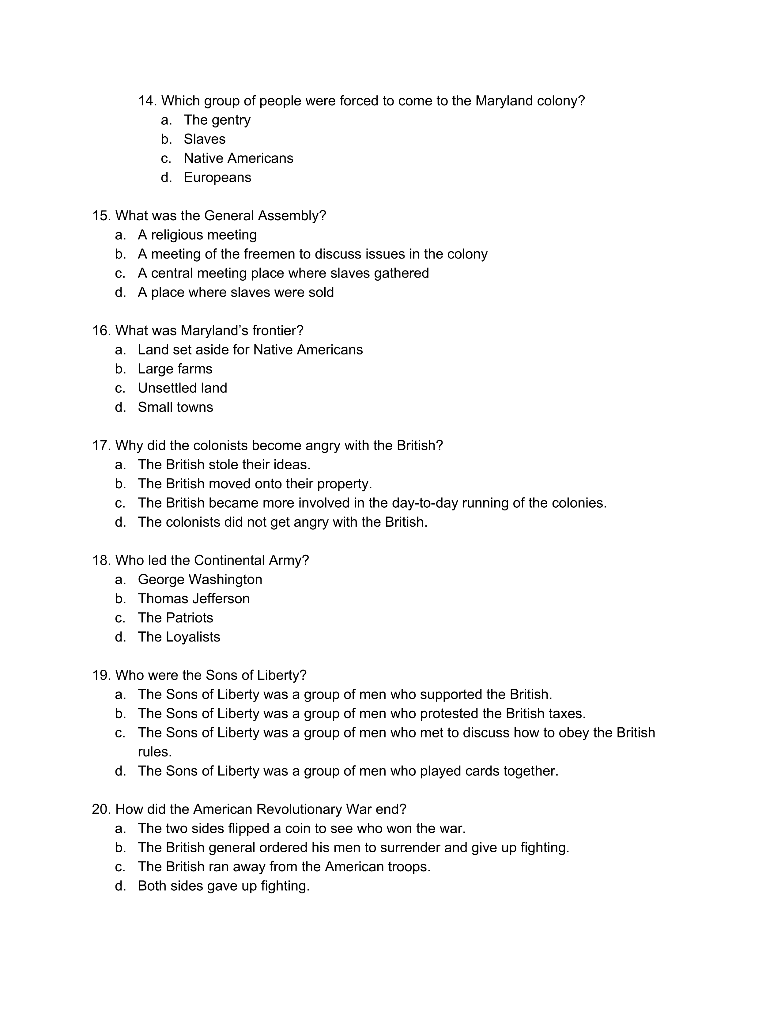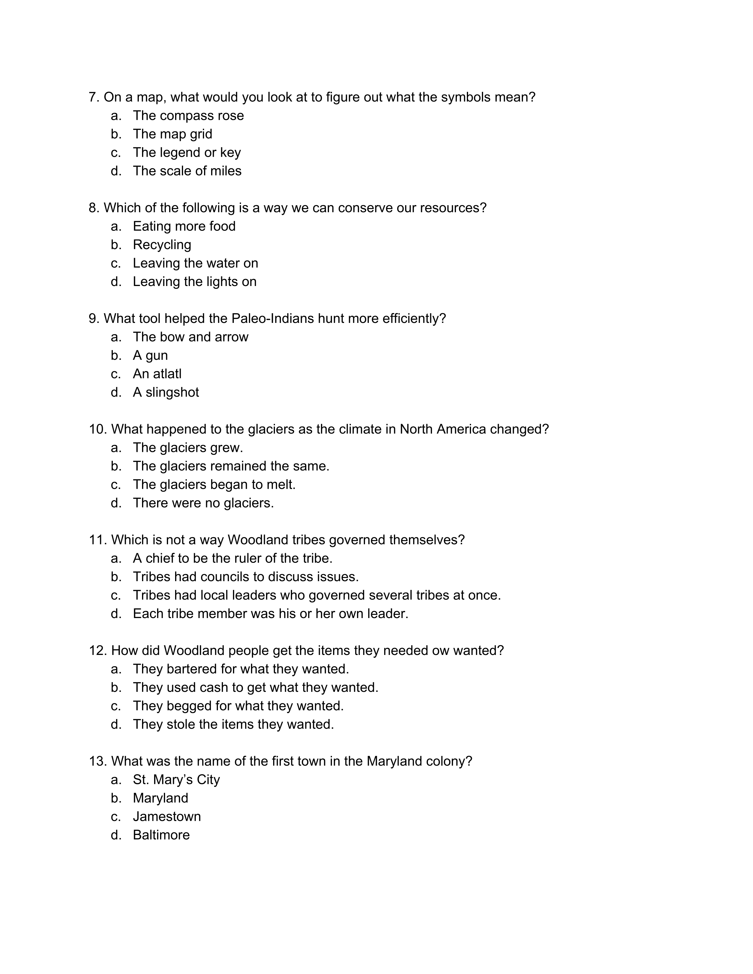 This is a preassessment of MD Gr. 4 Social Studies content standards that check for knowledge.
