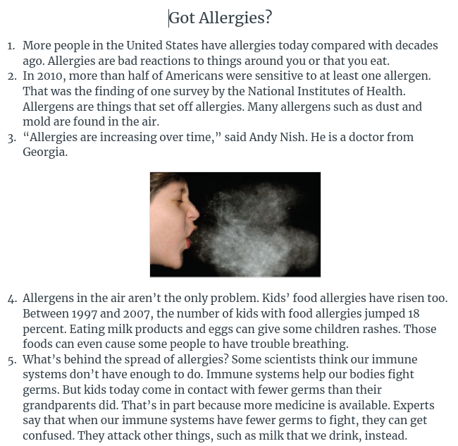 According to the article, what are allergies? ELA.5.4.3