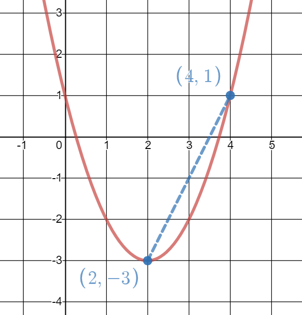 The parabola shown represents the graph of a function f(x). Use the dashed line to approximate the average rate of change of f(x) between x=2 and x=4