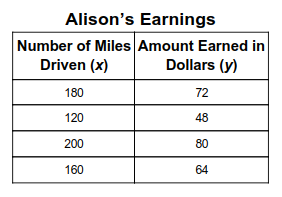 Write an equation to show the number of miles she drives (x) and the amount of money she earns (y). (Standard 7.RP.2)