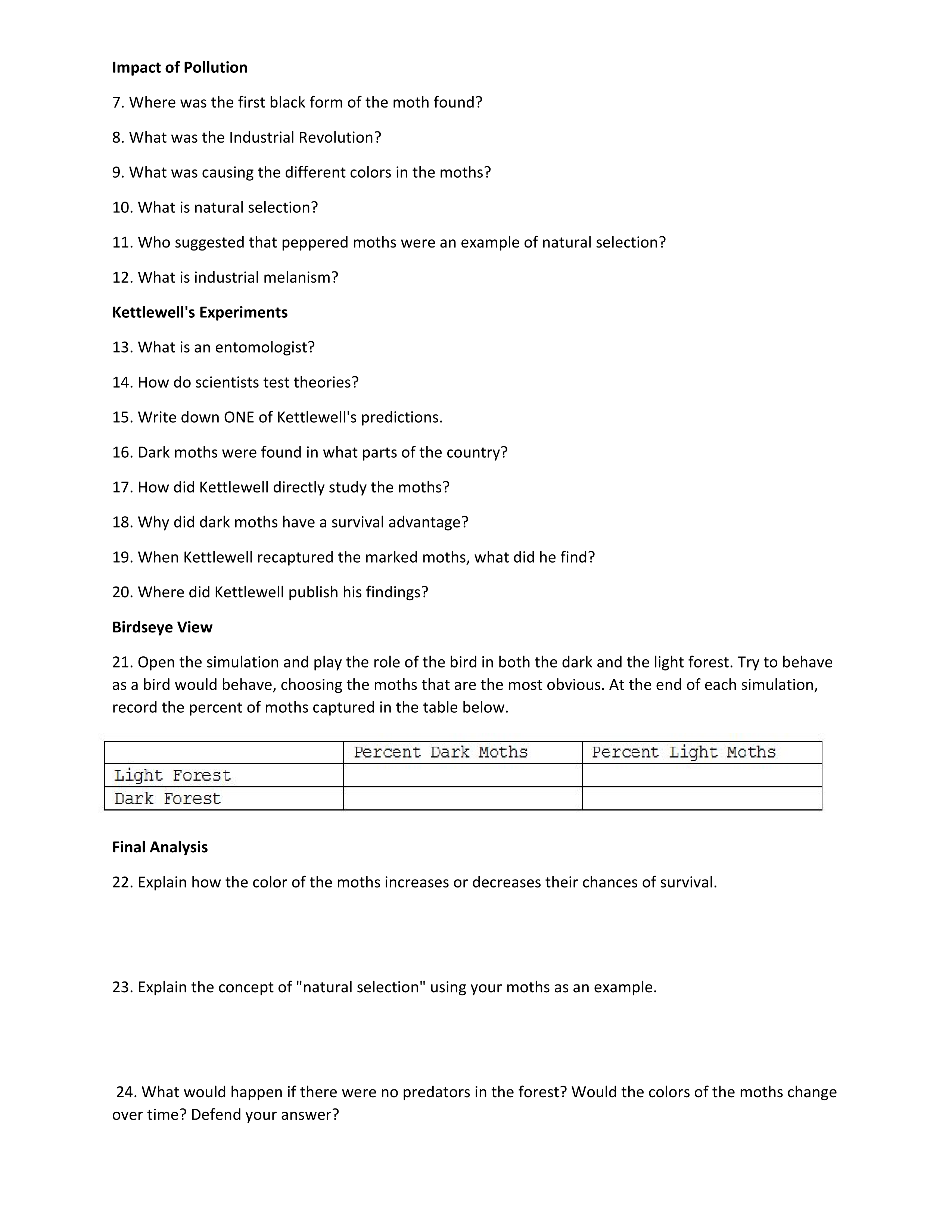 What would happen if there were no predators in the forest? Would the colors of the moths change over time? Defend your answer?