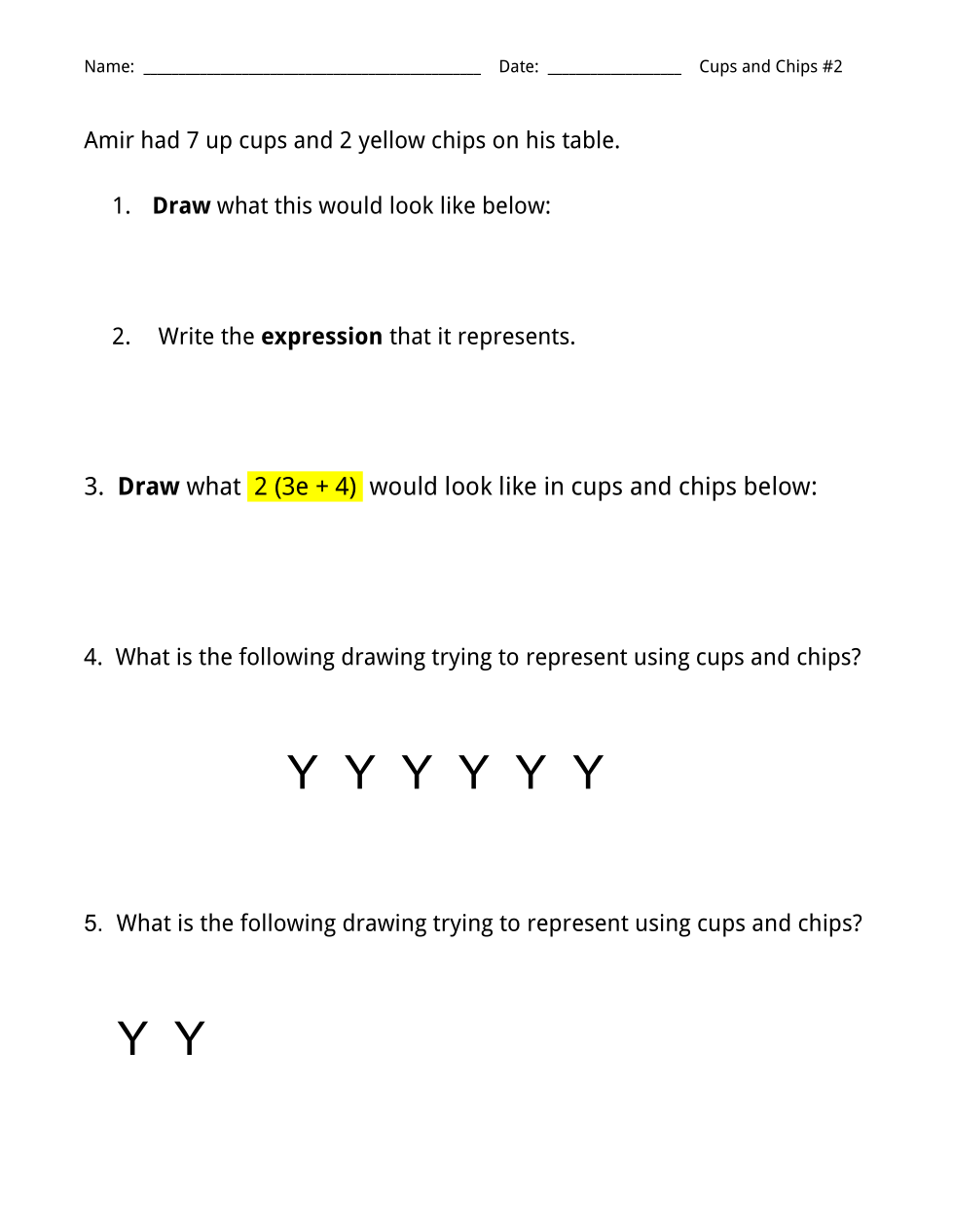 Using the "cups and chips" method, DRAW what Amir has on his table.