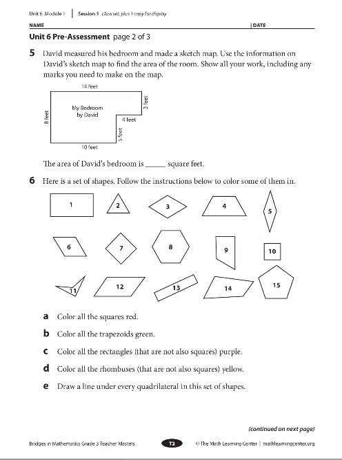 Color all the squares red.Color all the trapezoids green.Color all the rectangles (that are also squares) purple.Color all the rhombuses (that are NOT also squares) yellow.Draw a line under every quadrilateral in this set of shapes.