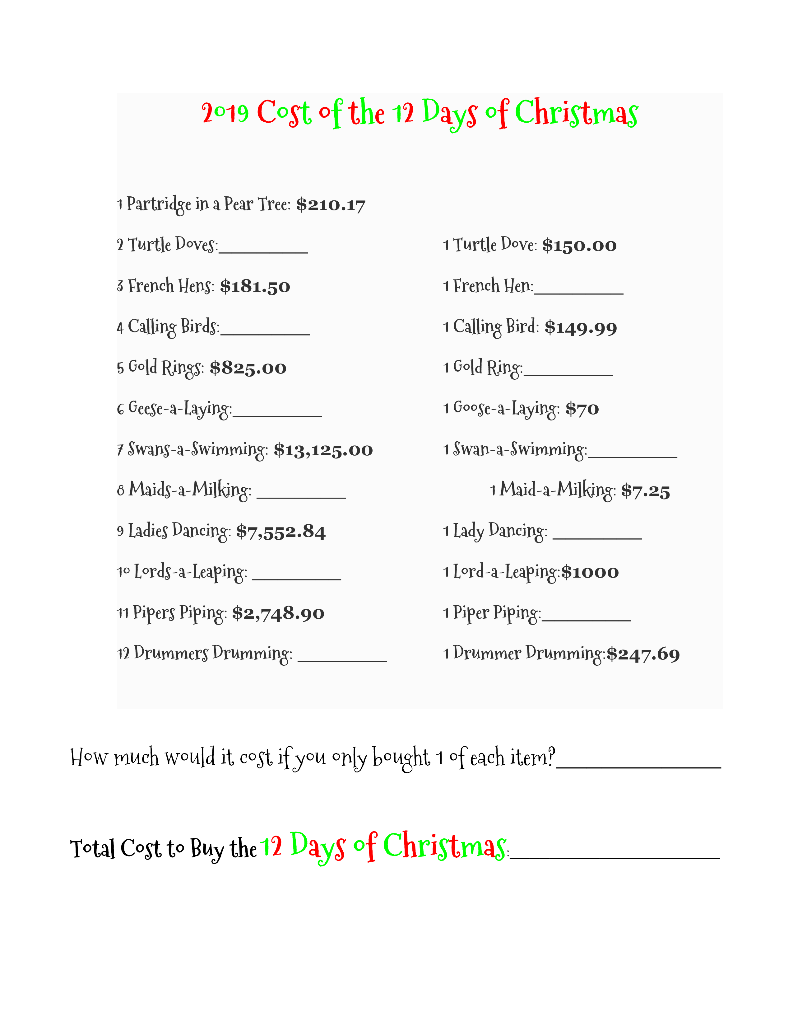Cost of 12 Days of Christmas