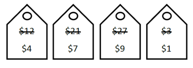 Mrs. Fennessy and her friends notice a sale at the store. Compare the crossed out prices to the new sale prices. If all the sale prices are calculated in the same way, what would the sale price be on an item that originally cost $24? Use words and equations to explain how you know.
