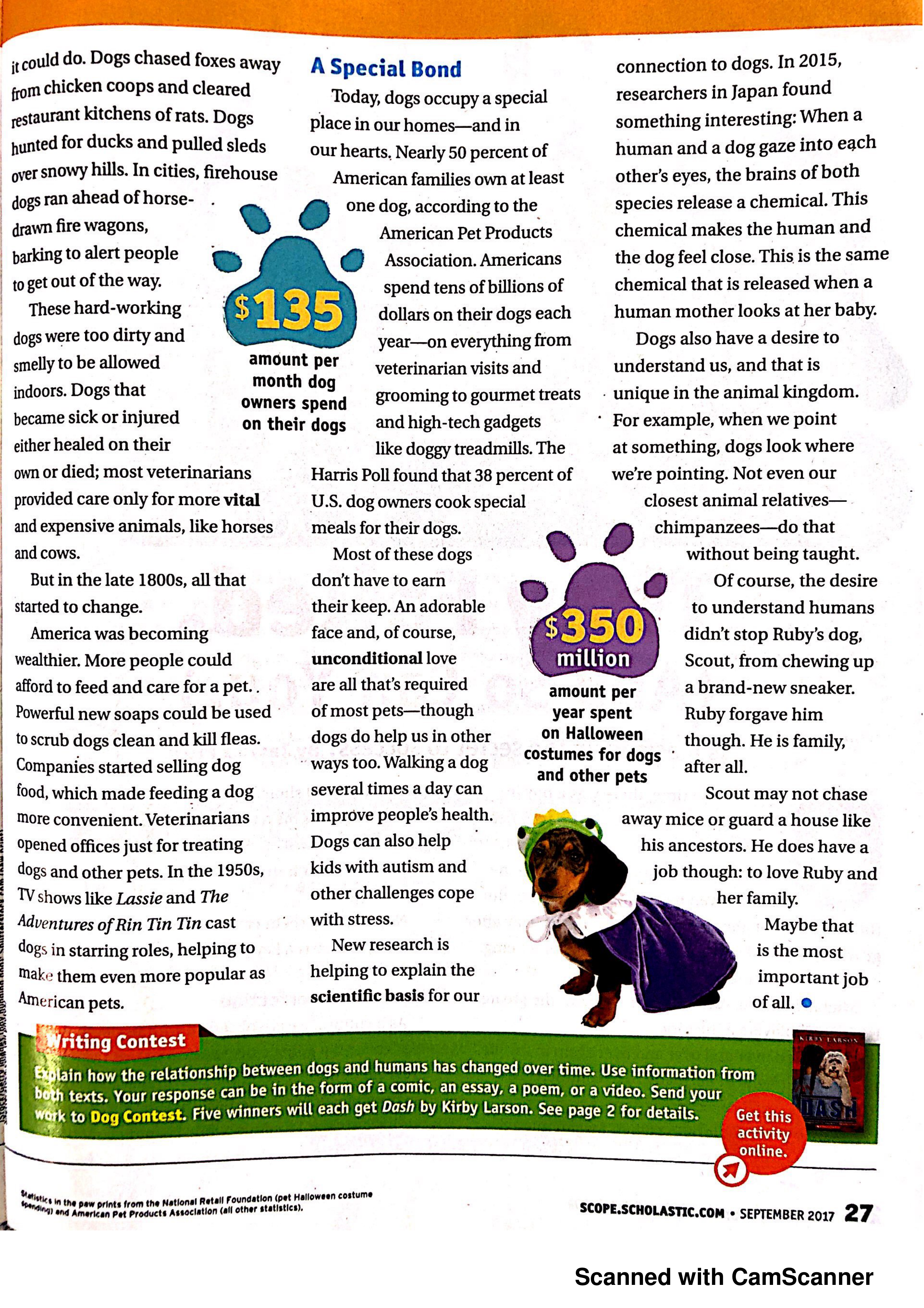 The paw print on page 27 notes that each year, people spend $350 million on Halloween costumes for dogs and other pets. This supports the idea that today,