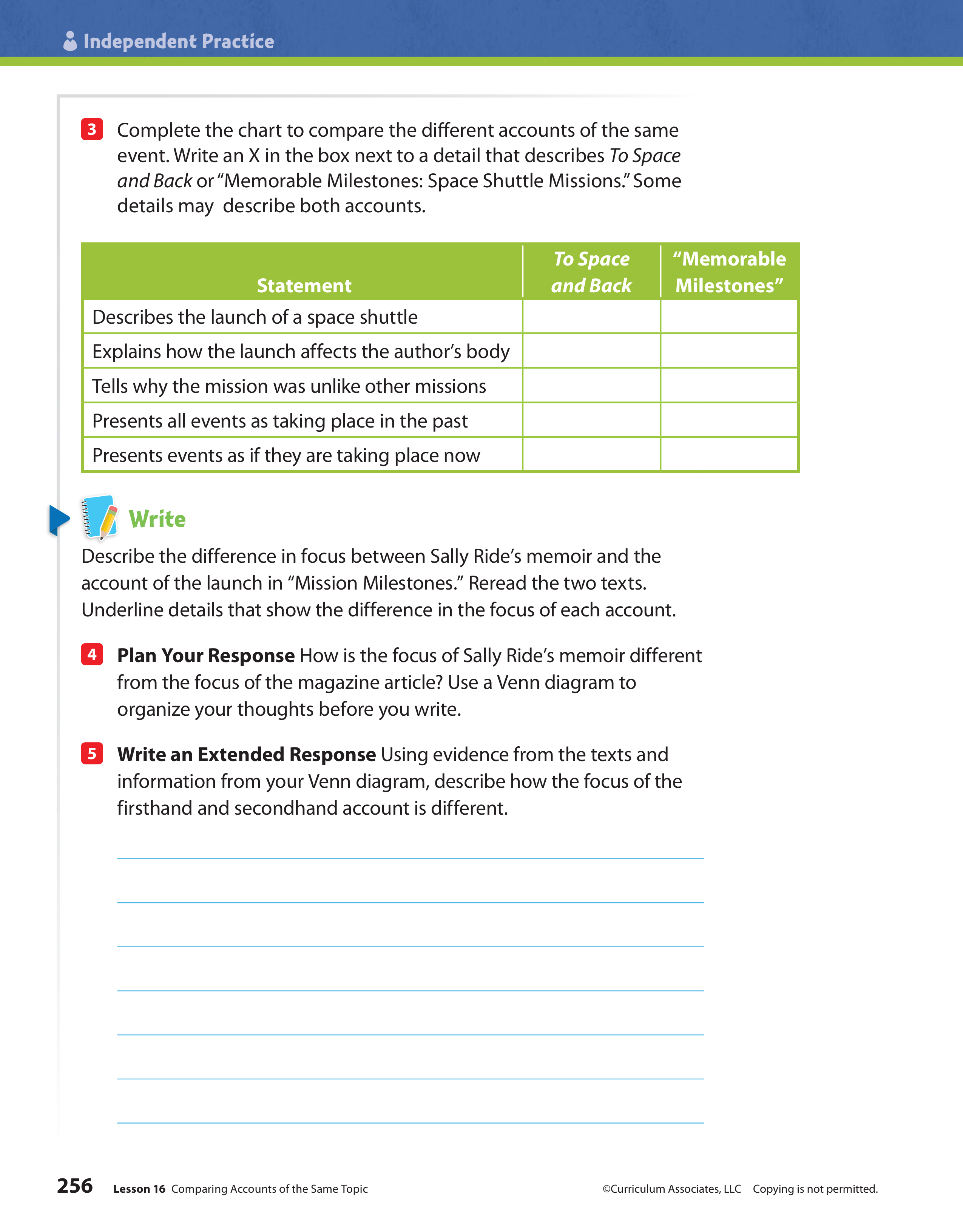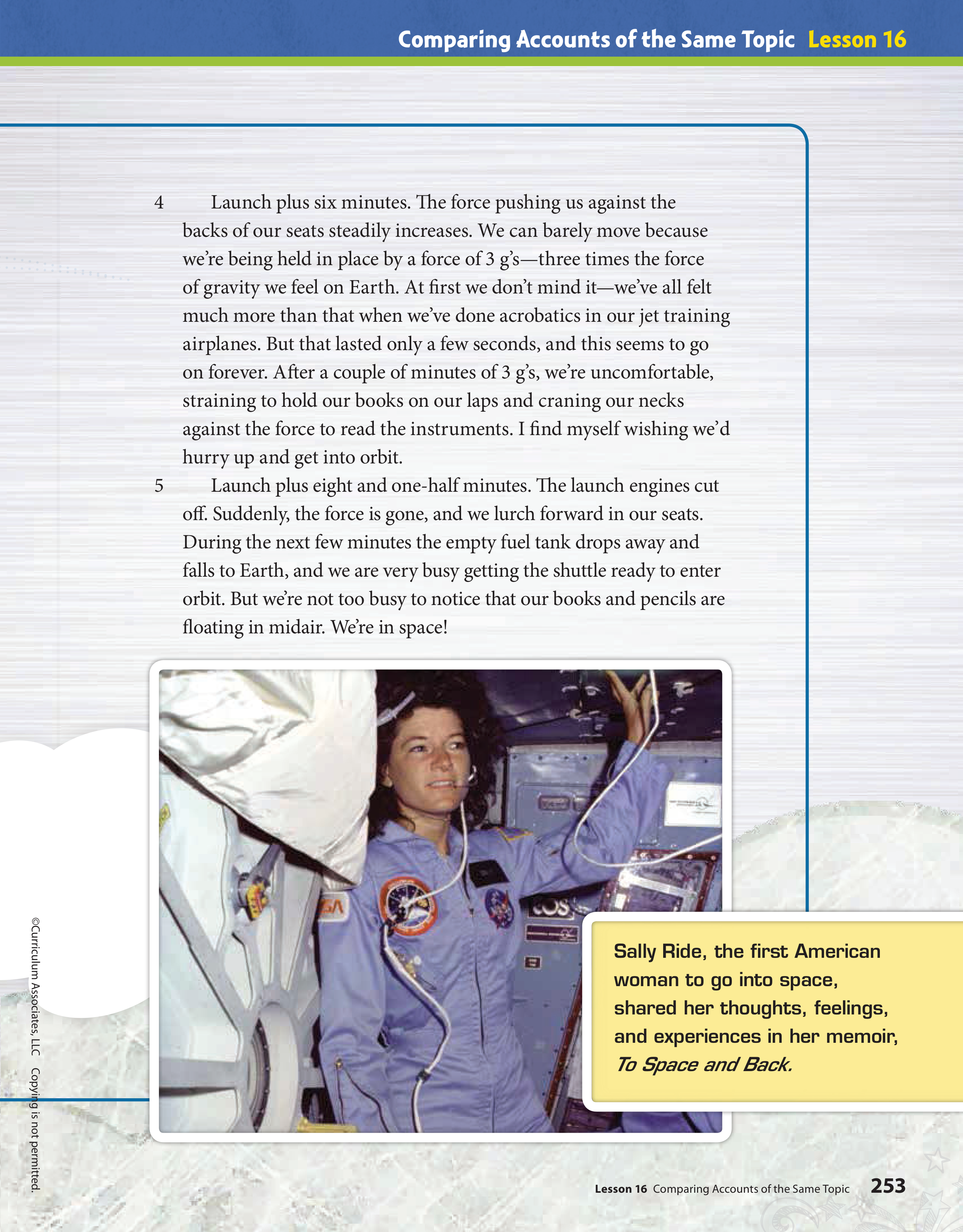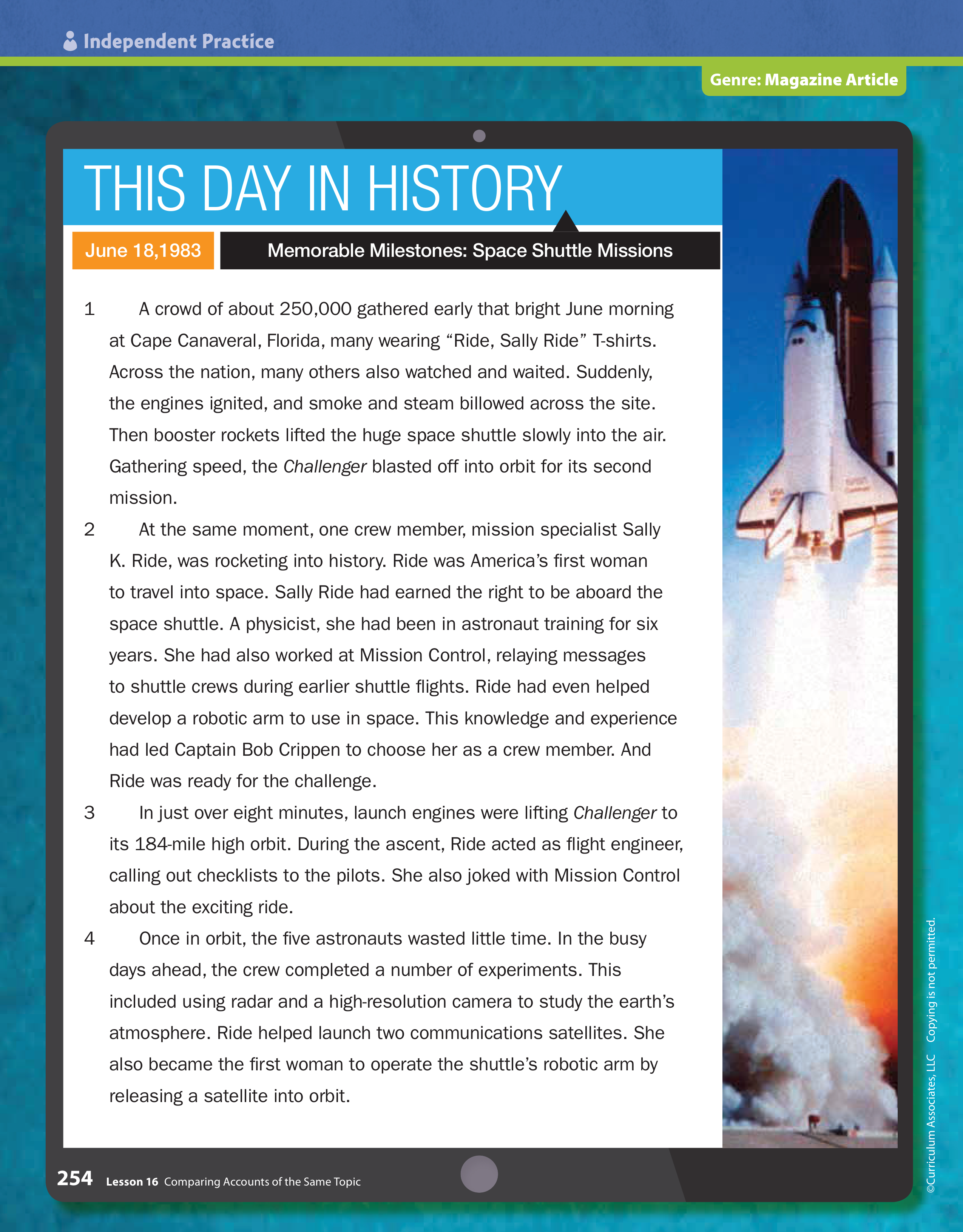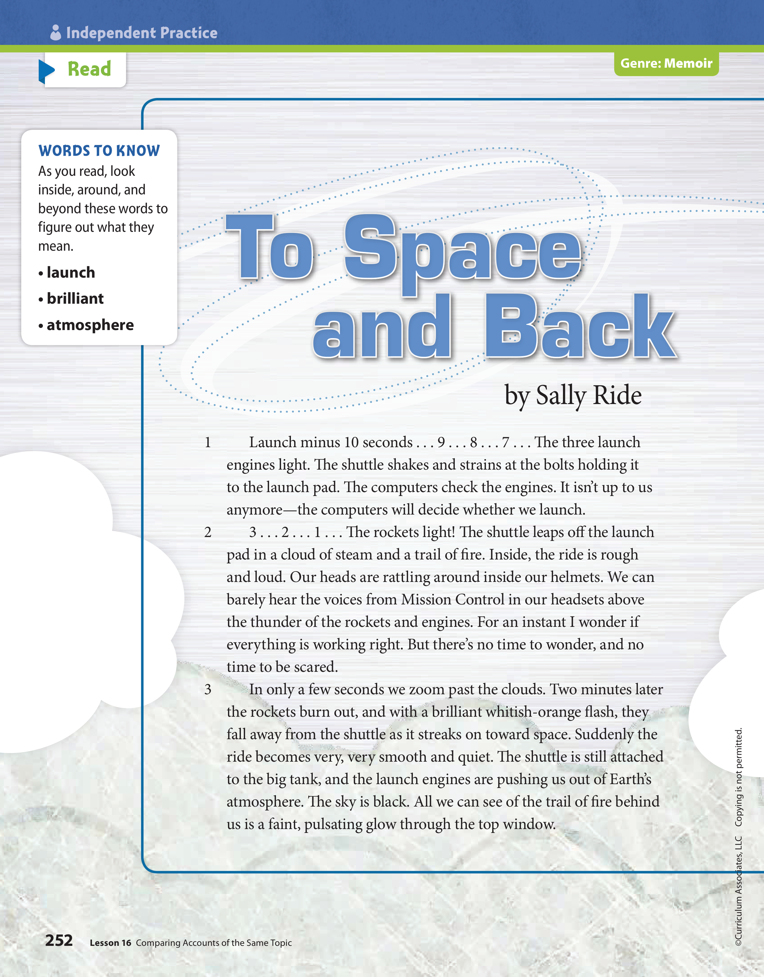 Describe the difference in focus between Sally Ride's memoir and the acount of the launch in "Mission Milestones." Reread the two texts. Underline details that show the difference in the focus of each account. Then, use that evidence to write an essay. You should include relevant text evidence from Sally Ride’s memoir that contrasts (differs) with information provided about the Challenger mission in the magazine article. You may use a Venn Diagram to help you organize your thoughts before you write. Use your rubric to check your work and remember to only write about how the memoir and magazine article are different and use evidence from both texts.