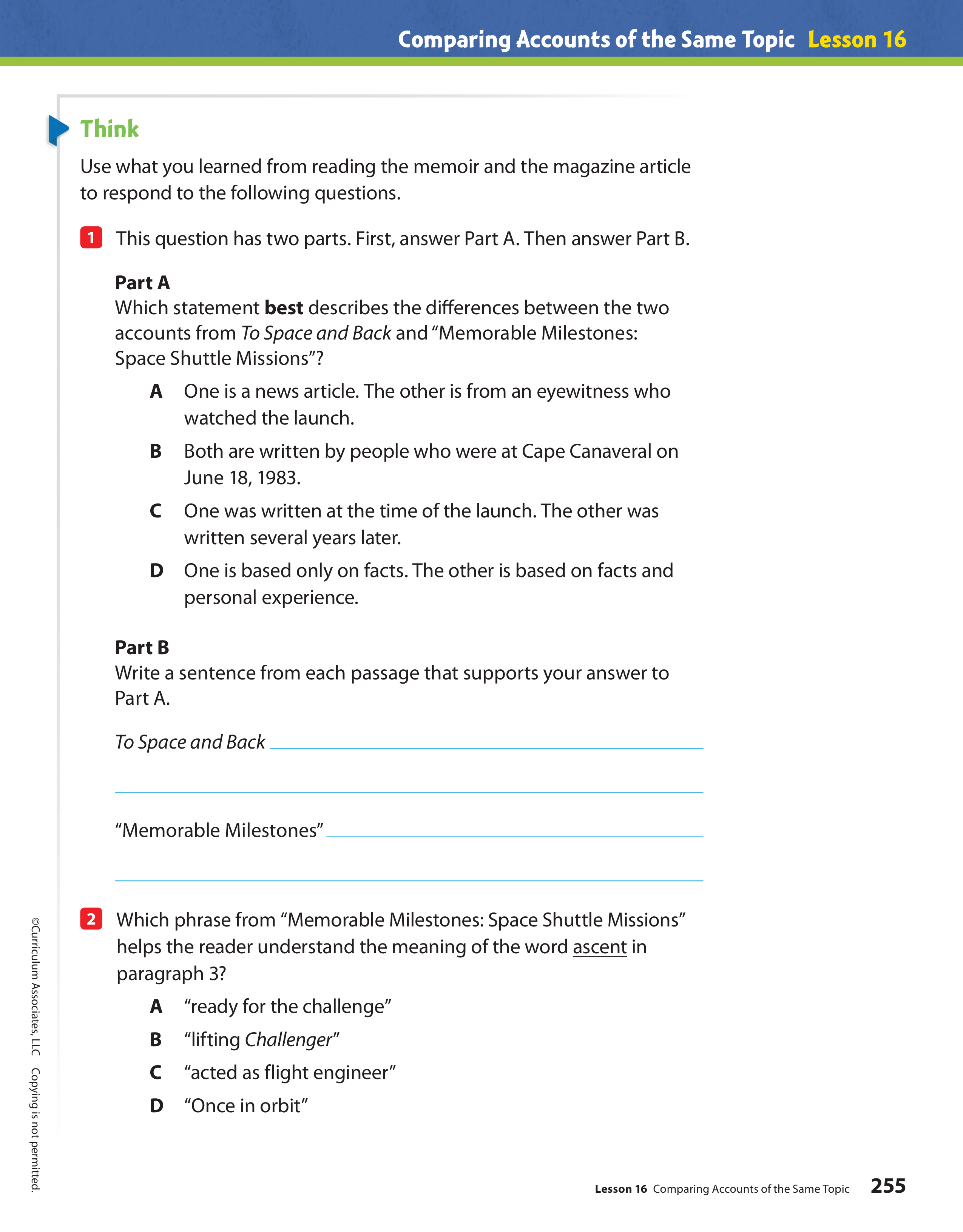 Write a sentence from each passage that supports your answer to Part A. One sentence starts with To Space and Back, then give your evidence. Next, write another sentence that starts with Memorable Milestones and give your evidence.